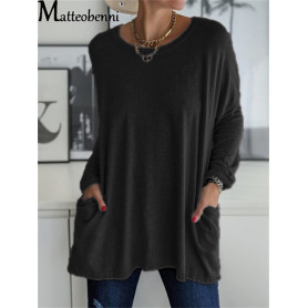 2021 Women Autumn Fashion Tunic Top Pocket Solid Color Loose Round Neck Long-sleeved T-Shirt Streetwear Casual Vintage Pullovers