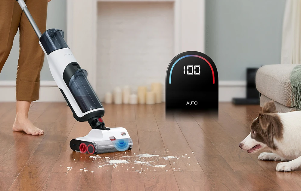Clean smart, not hard. In a fight against tough stains, adaptive cleaning turns up suction and water automatically. In tandem, an on-screen indicator tells you how dirty your floor is. Now you know where to focus.
