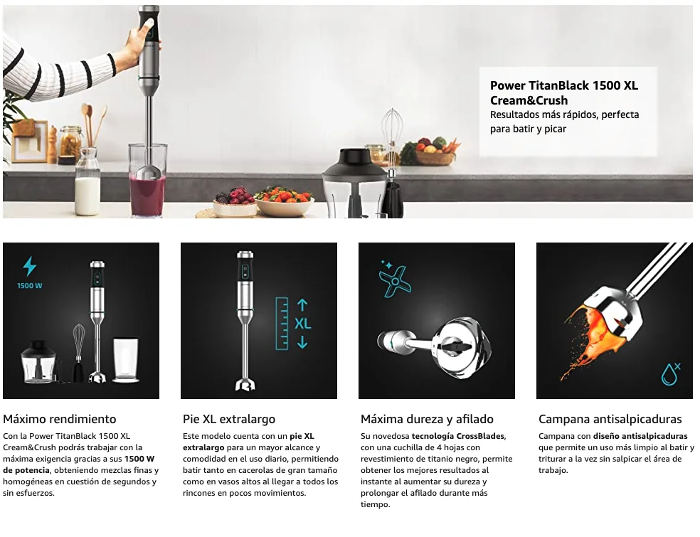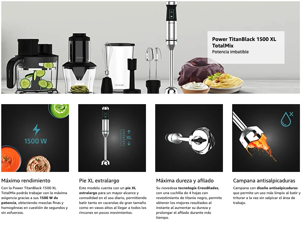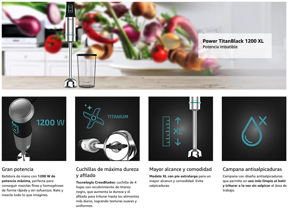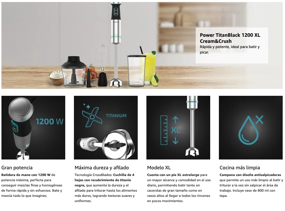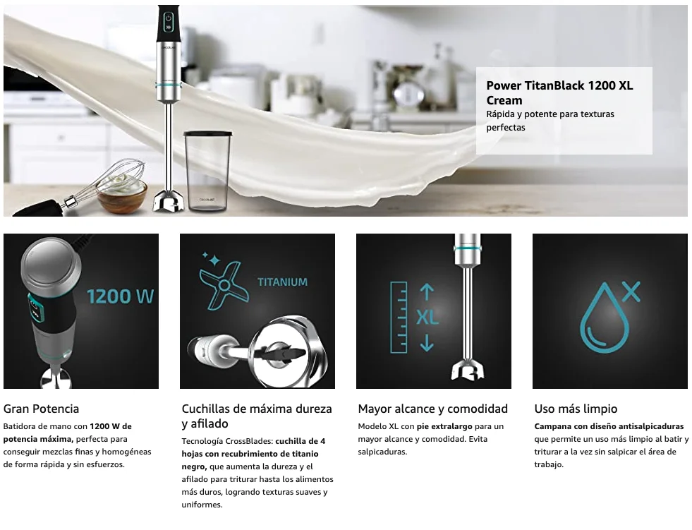 Cecotec hand mixer Power TitanBlack XL. 1200-1500W, CrossBlades technology with blades 4 sheets, foot XL, anti-splash