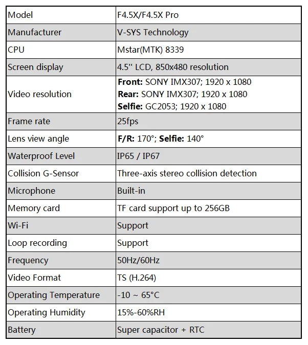 VSYS F4.5X features Mstar 8339 CPU that records at 25 frames per second in 1920x1080 resolution. The built-in Sony IMX307 CMOS image sensor and 7-layer all-glass lens provides crisp, smooth and wide footage. Greatly enhances night vision at the low light environment, making your driving safer at night.