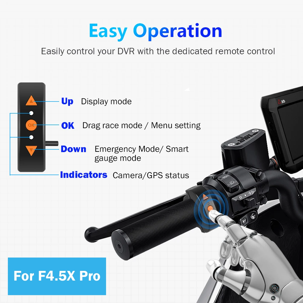 The F4.5X/F4.5X Pro is a 2~3 channel full HD motorcycle dash cam with a 4.5'' large screen. You can easily check and record front, rear, or selfie view of your bike in real-time. Thanks to the use of the SONY 307 Starvis sensor, it captures every detail even when you're driving at night. And it adds real-time speed, location ,Trip meter and TPMS feature which allows you to monitor your bike's health at all times.