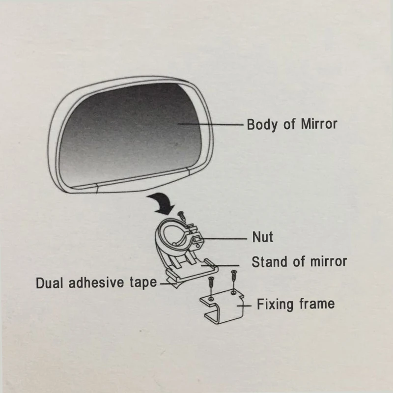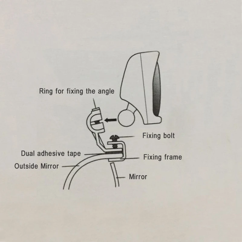 2). rip off paper cover: from the adhesive; Put the stand of mirror with dual-adhesive tape on the upper of outside mirror.
