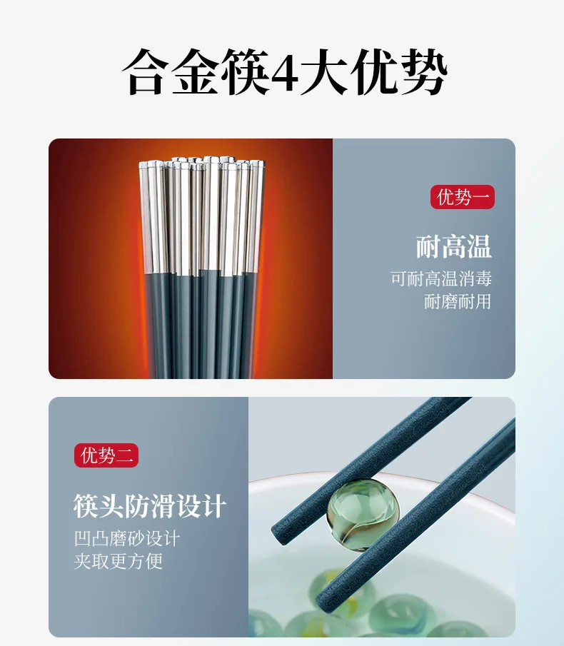 Material: Aluminum alloy (alloy chopsticks are made of materials synthesized by "polymer materials" and "glass fibers", which have some special properties, such as high hardness, high wear resistance, high toughness, and durability. Corrosive, etc.)