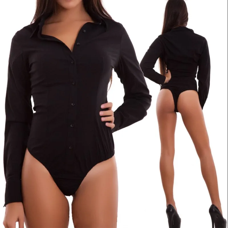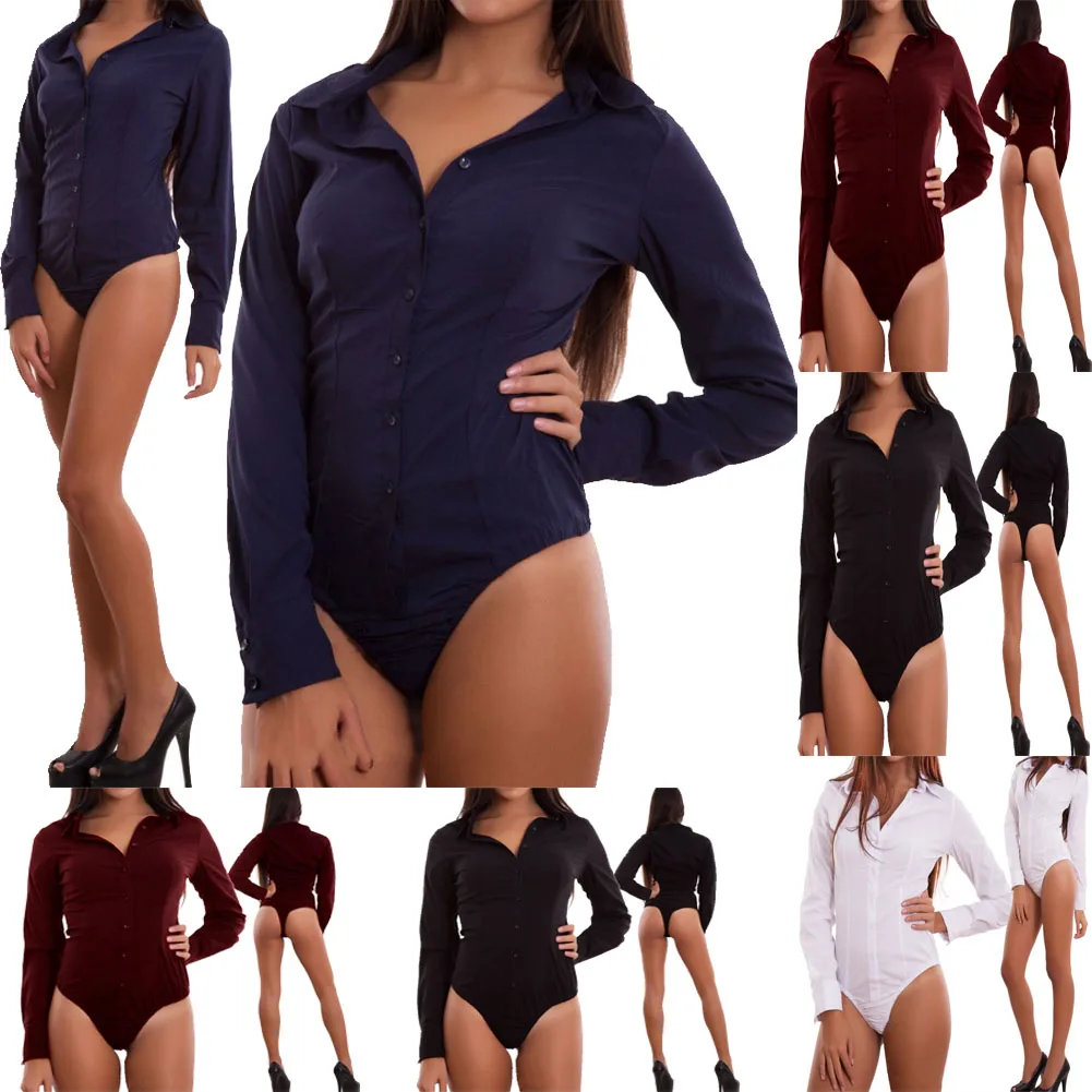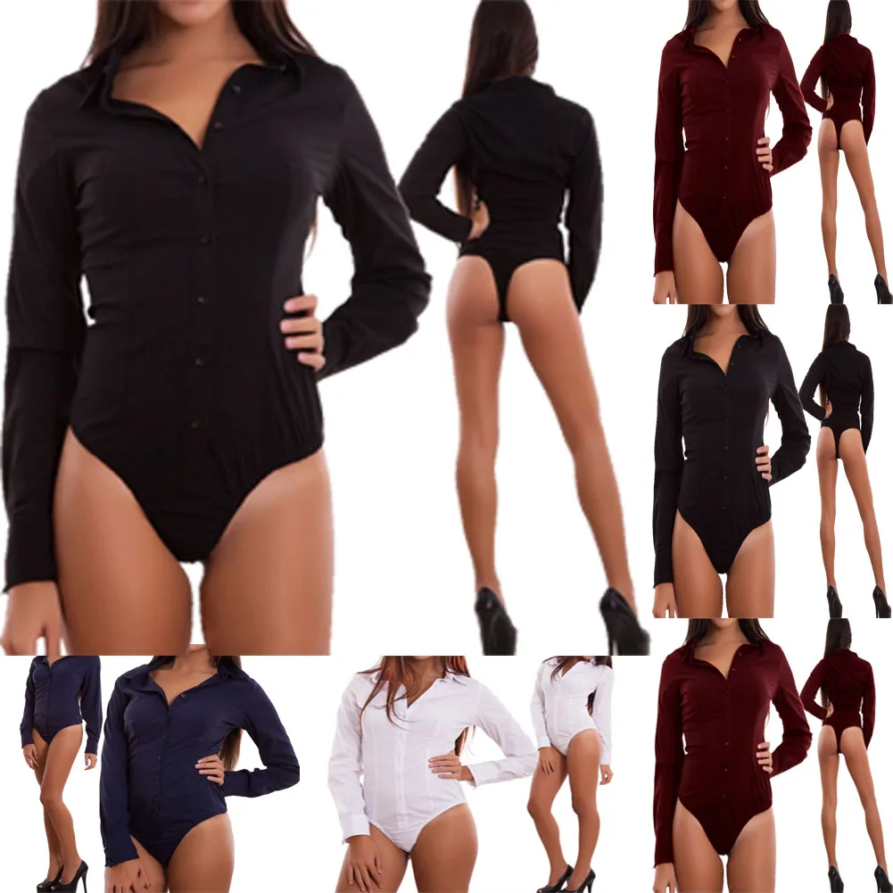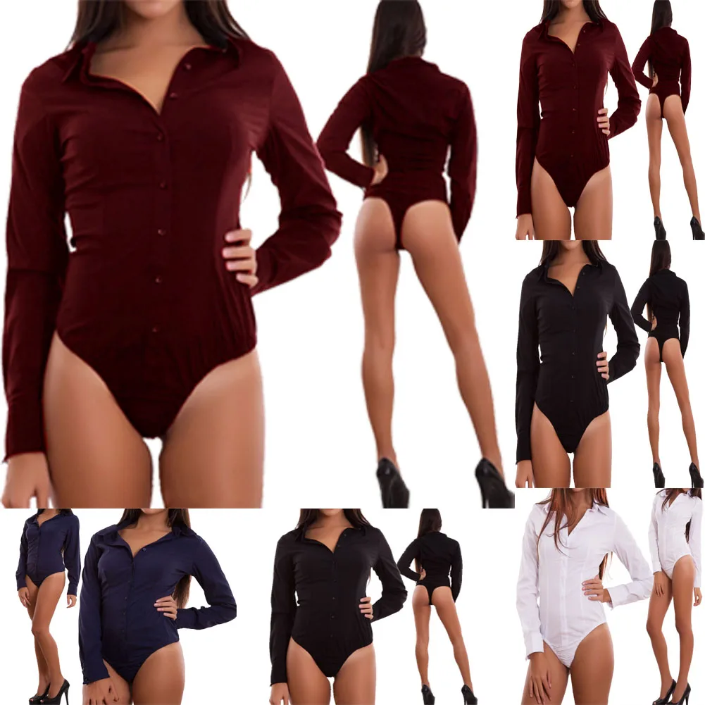 Women Fashion Casual Turn-down Collar Long Sleeve Jumpsuit Solid Button Romper Body Top Leotard T shirt Bodysuit Autumn