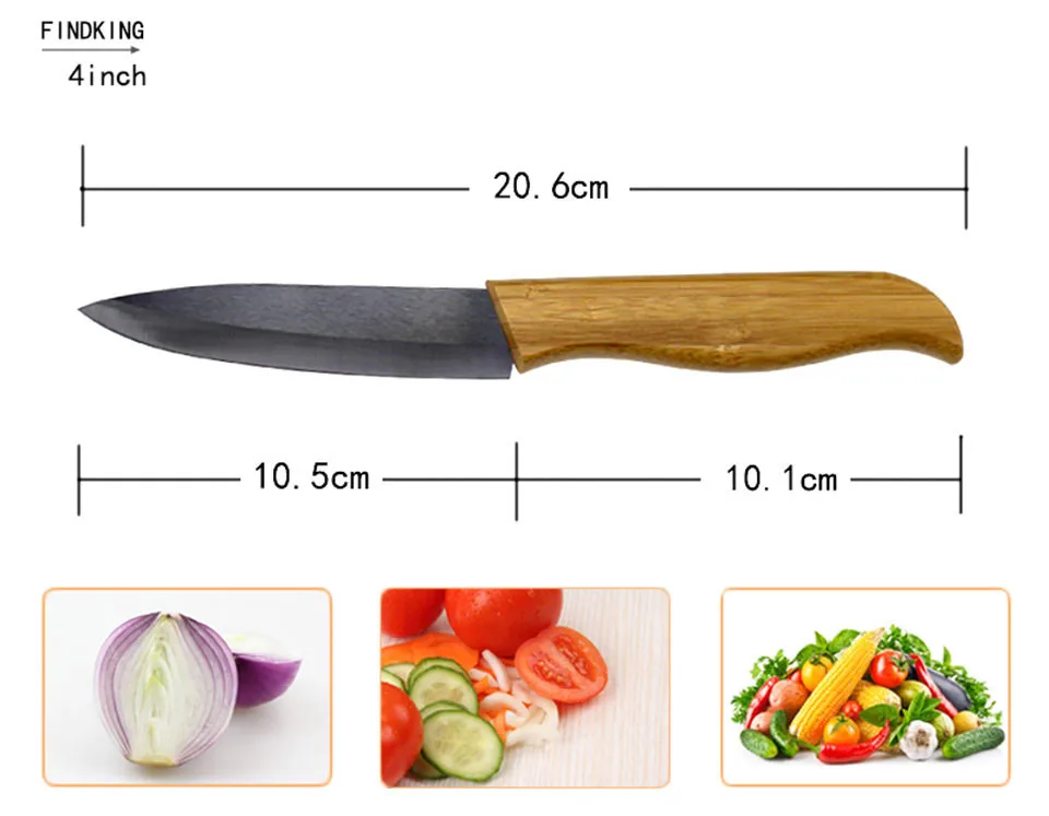 This ceramic knife set includes four knives of different size, They are made of ceramic and ABS material. Enjoy the healthy and eco-friendly life with them!