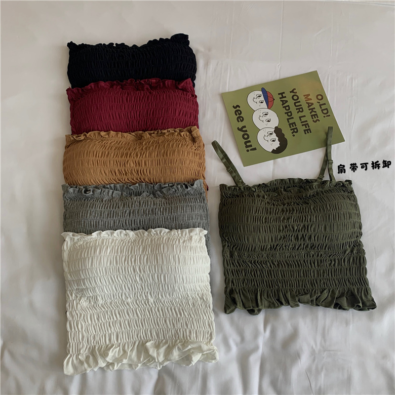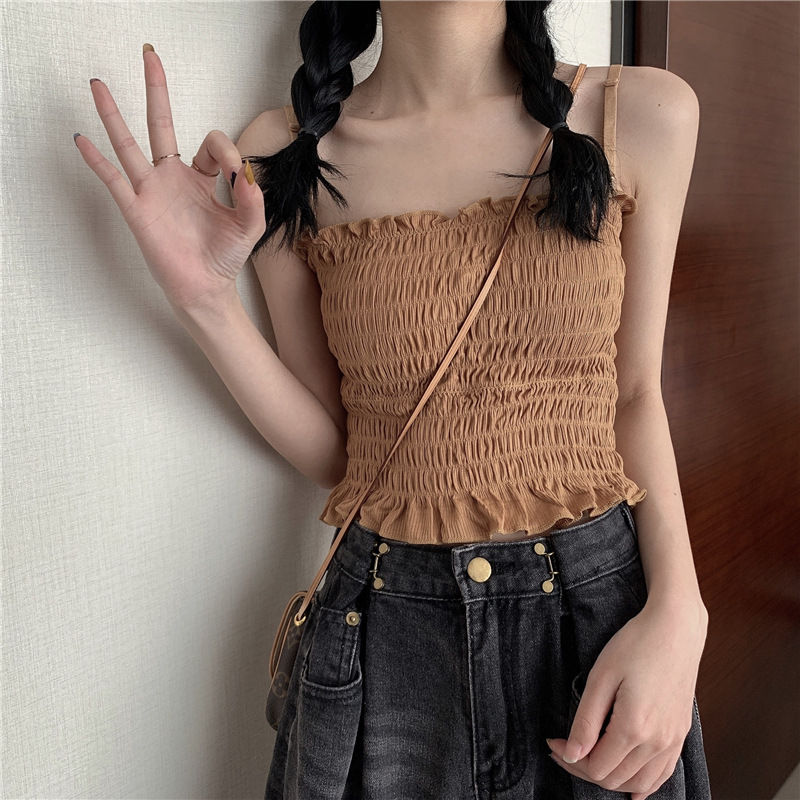 Camisoles Women Summer Pleated Fungus-line Adjusted-strap Sexy Solid Womens Korean Style Tank-tops Fashion Outwear Skinny Chic