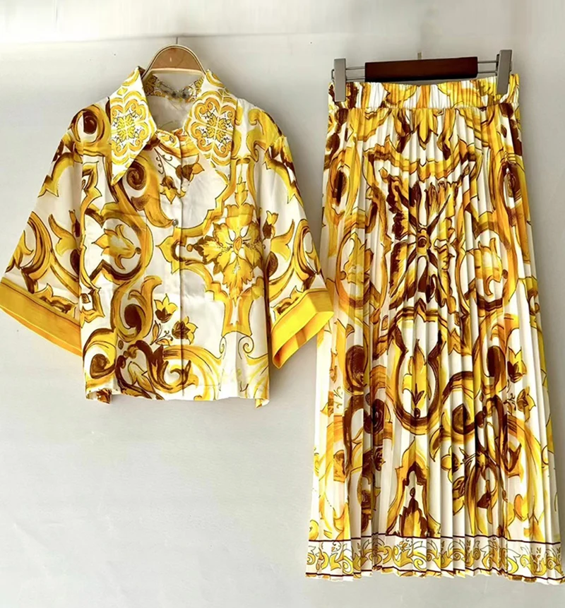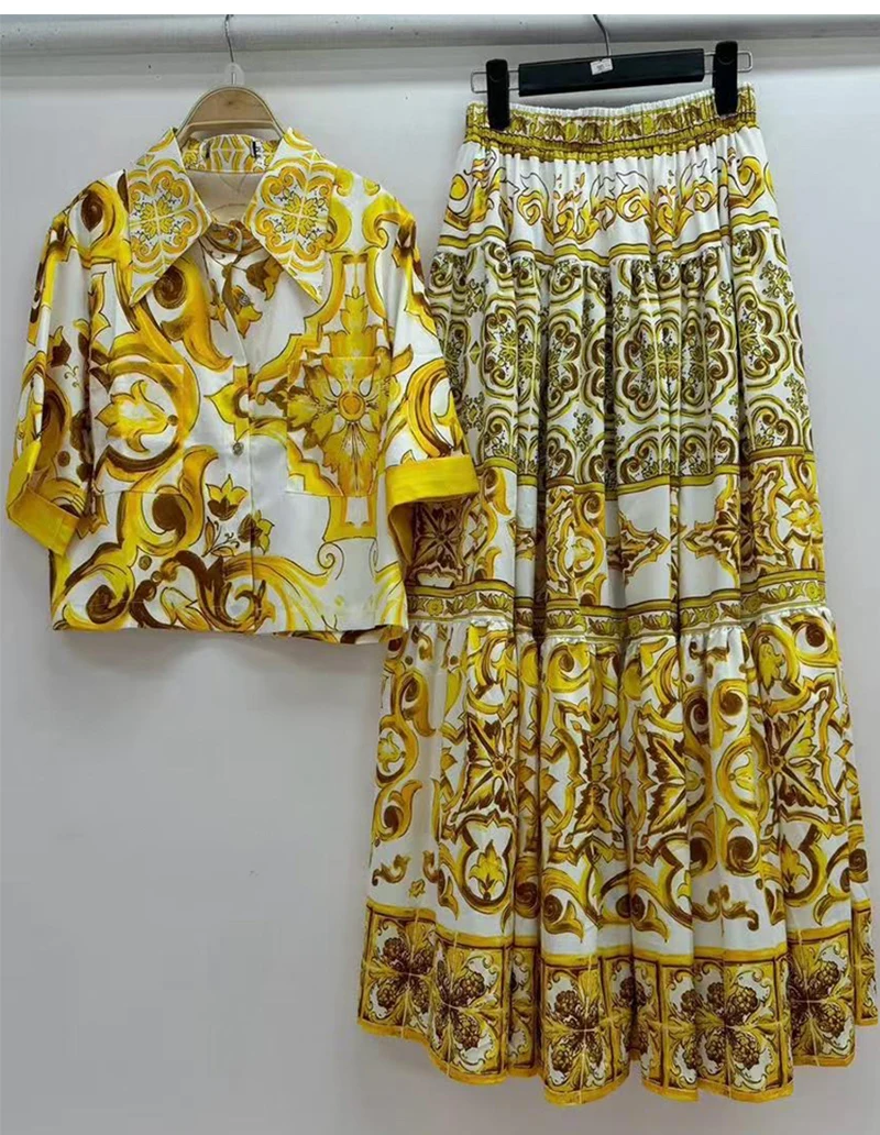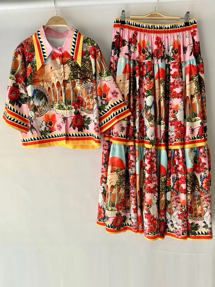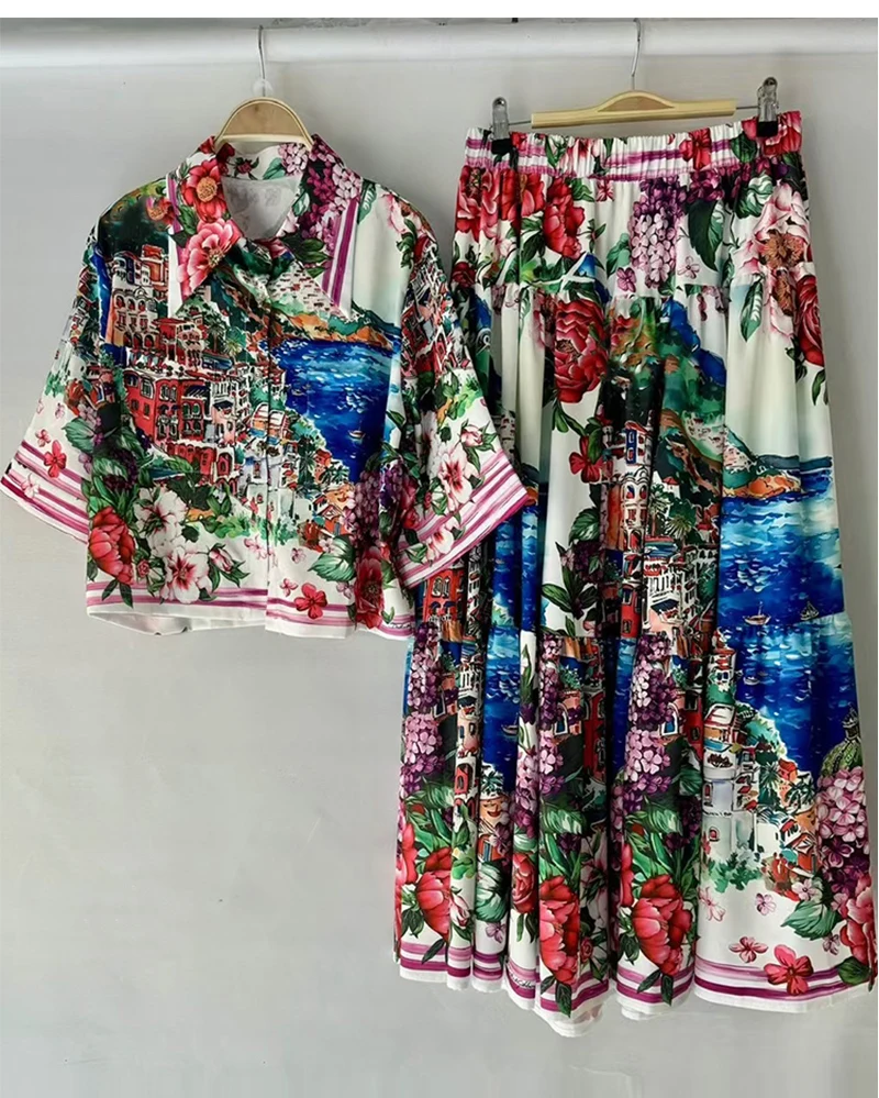 Summer women's new two-piece lapel short sleeve short printed shirt+high waist and big skirt fashion and elegant suit
