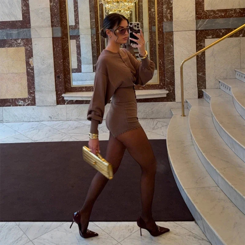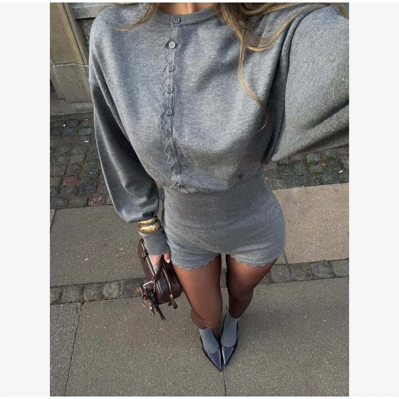 Slim Fit Ribbed Two-piece Set Grey Knit Casual Long Sleeve Crop Top High Waist Shorts Sets Elegant Daily Looks Chic Wear