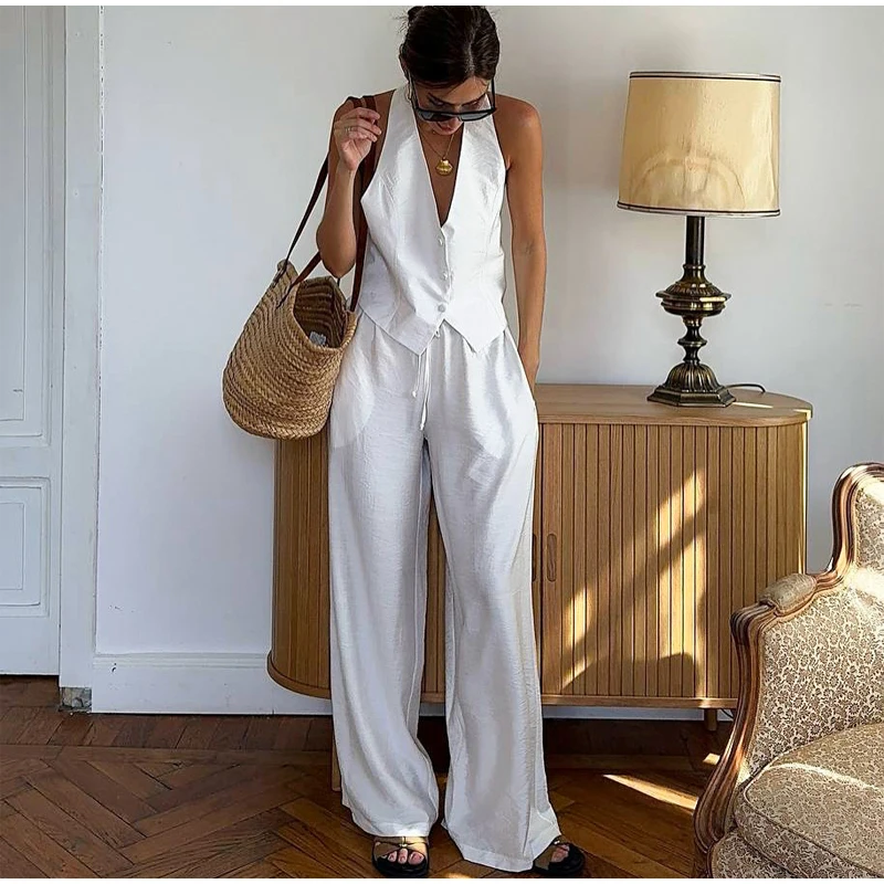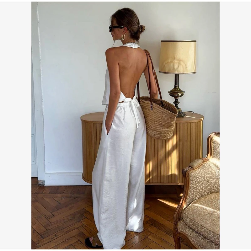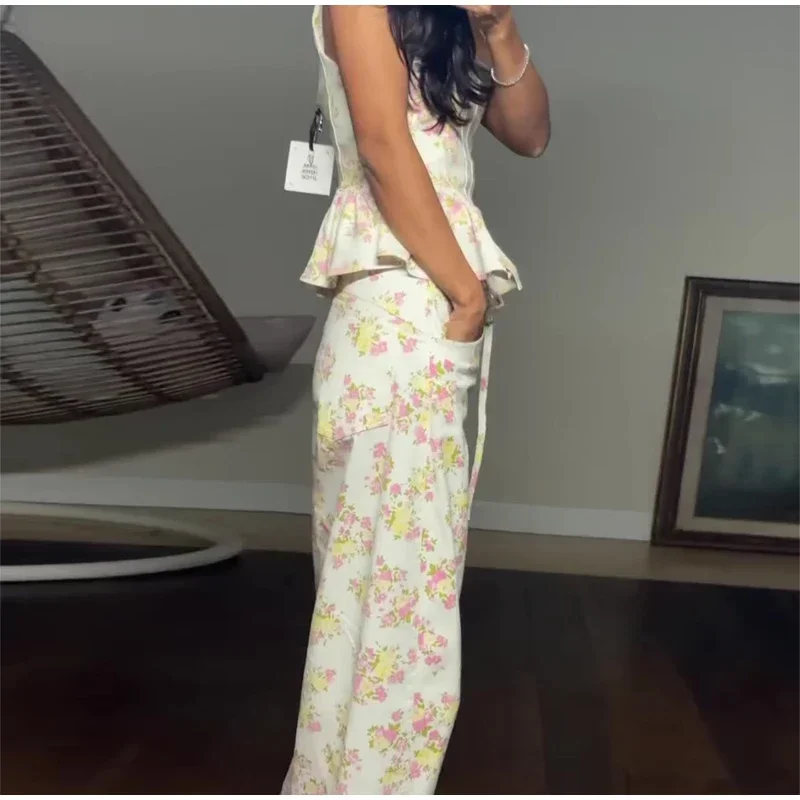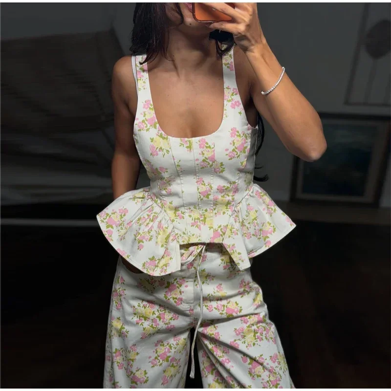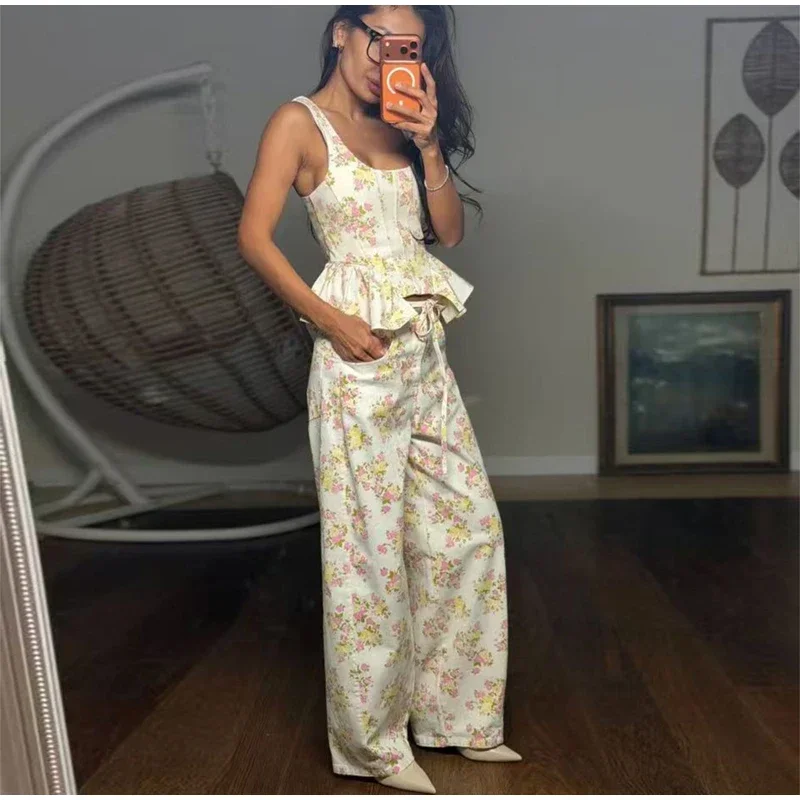 Elegant Floral Print Set Women Square Neck Sleeveless Ruffle Top Lace Up Floor Length Wide Leg Pants Sets Lady Casual Outfits