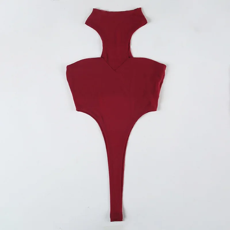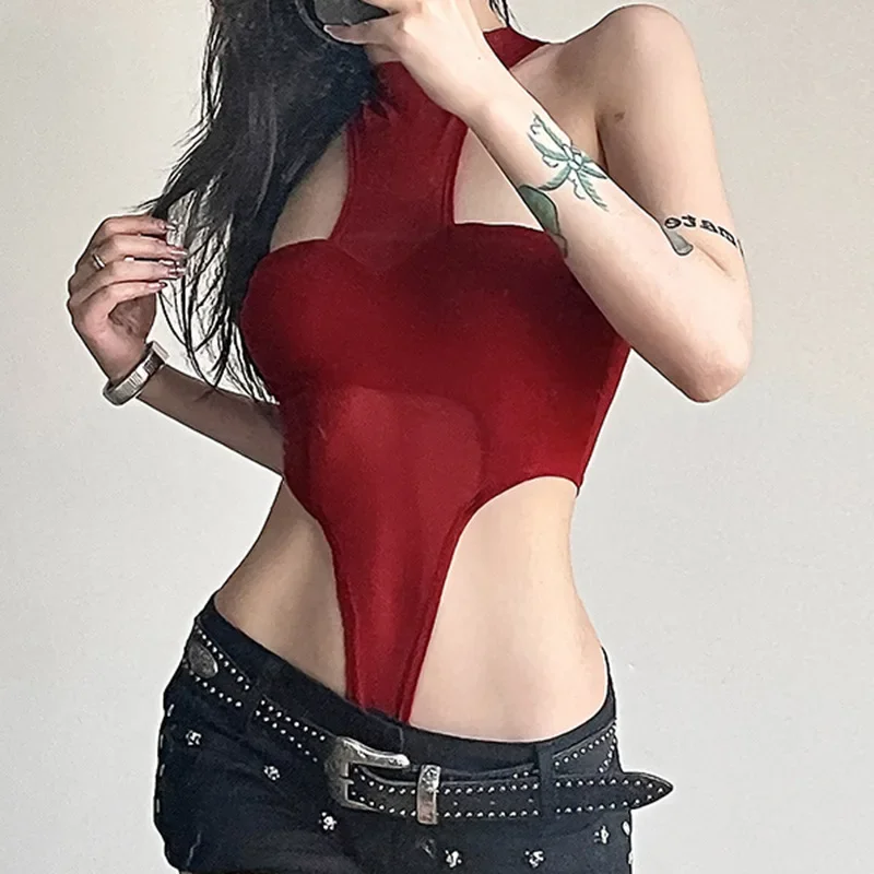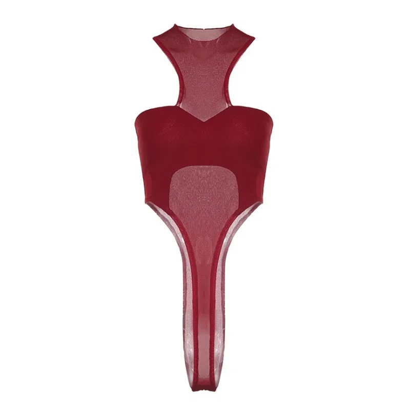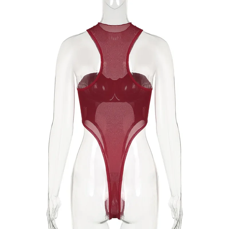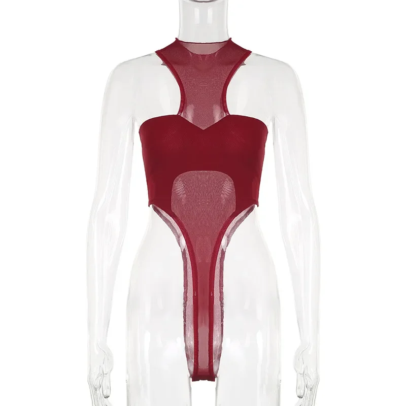 See Through Mesh Sexy Bodysuit Lingerie Women Rave Outfit Solid Red Body Feminino Neck-mounted Y2k Clothes One-pieces Corset Top