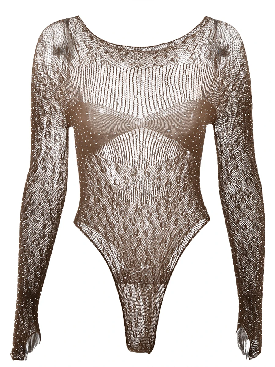 Women Rhinestone Tshirt Bodysuit Slim Knitted See Through Long Sleeve Romper Tops with Thumb Holes for Party Club