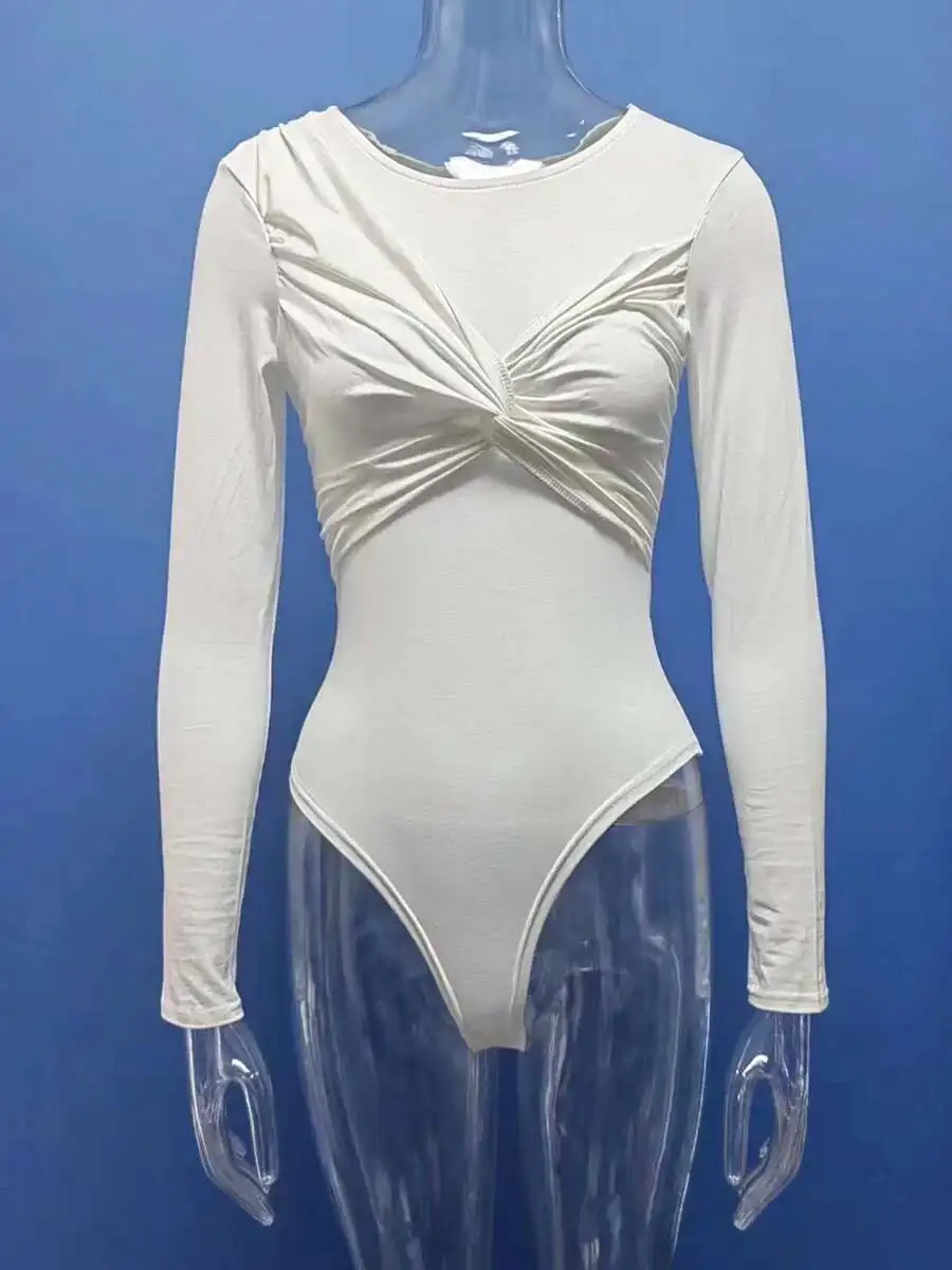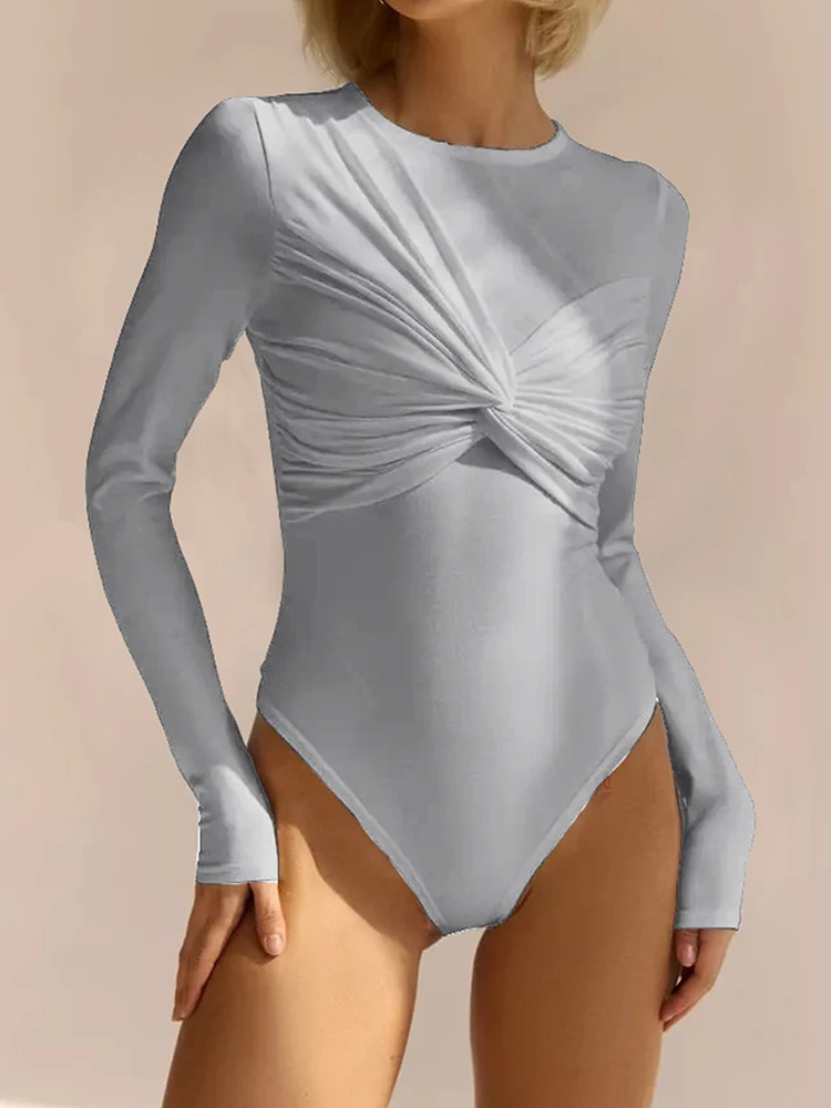 Aoaiiys Fashion Rompers Women O Neck Long Sleeve Solid Bodysuit Fashion Pleated Slim Sexy Jumpsuit 2026 Spring Women's Clothing