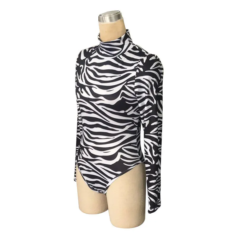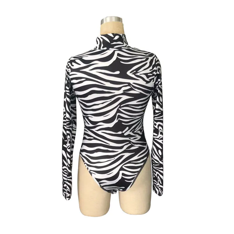 Women Zebra Printed High Collar Jumpsuit Sexy Underwear Long Sleeve Shapewear Bodysuit Chic Tight Slim Bodyshaper Skinny Outfits