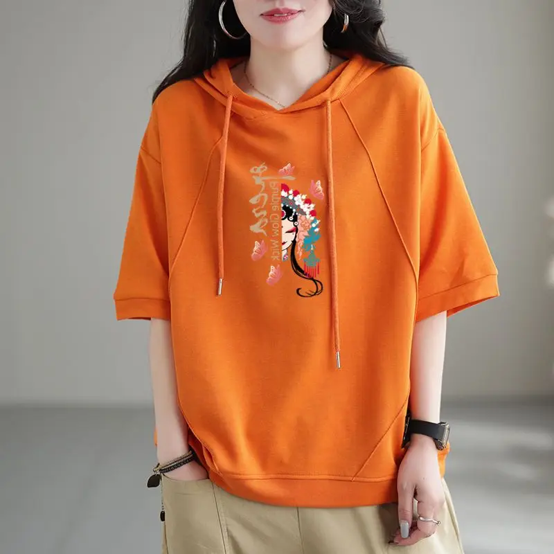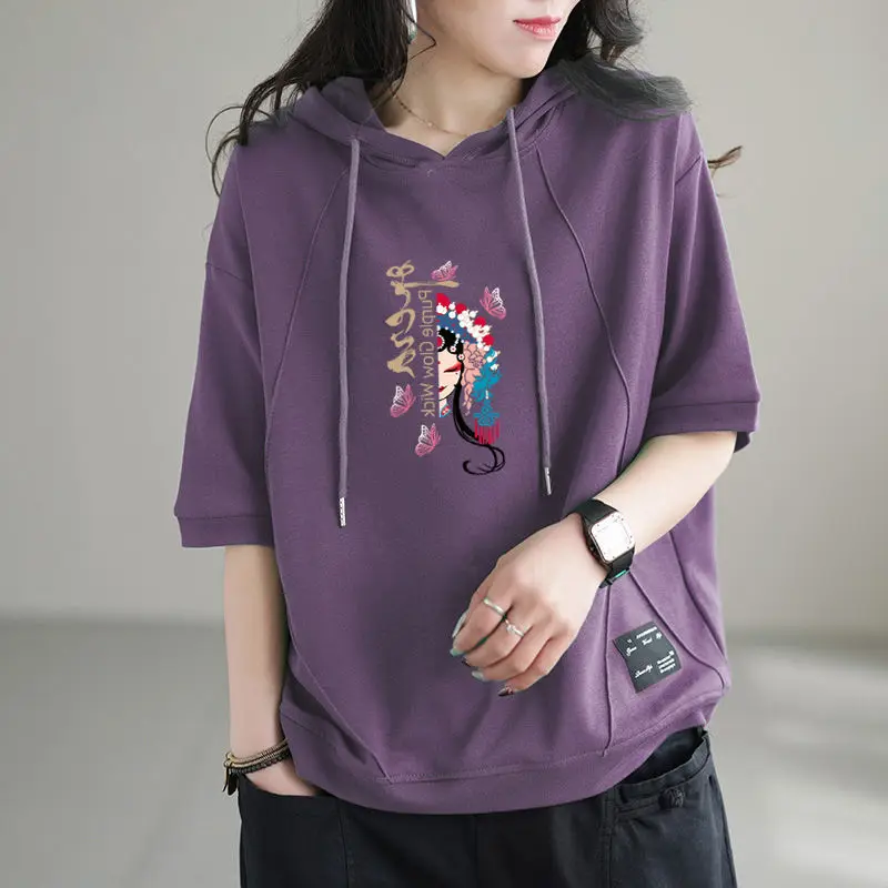 2024 New Summer Retro Art Chinese Style Loose Oversized Casual Sports Fashion Printed Short Sleeve Hooded Sweater for Women