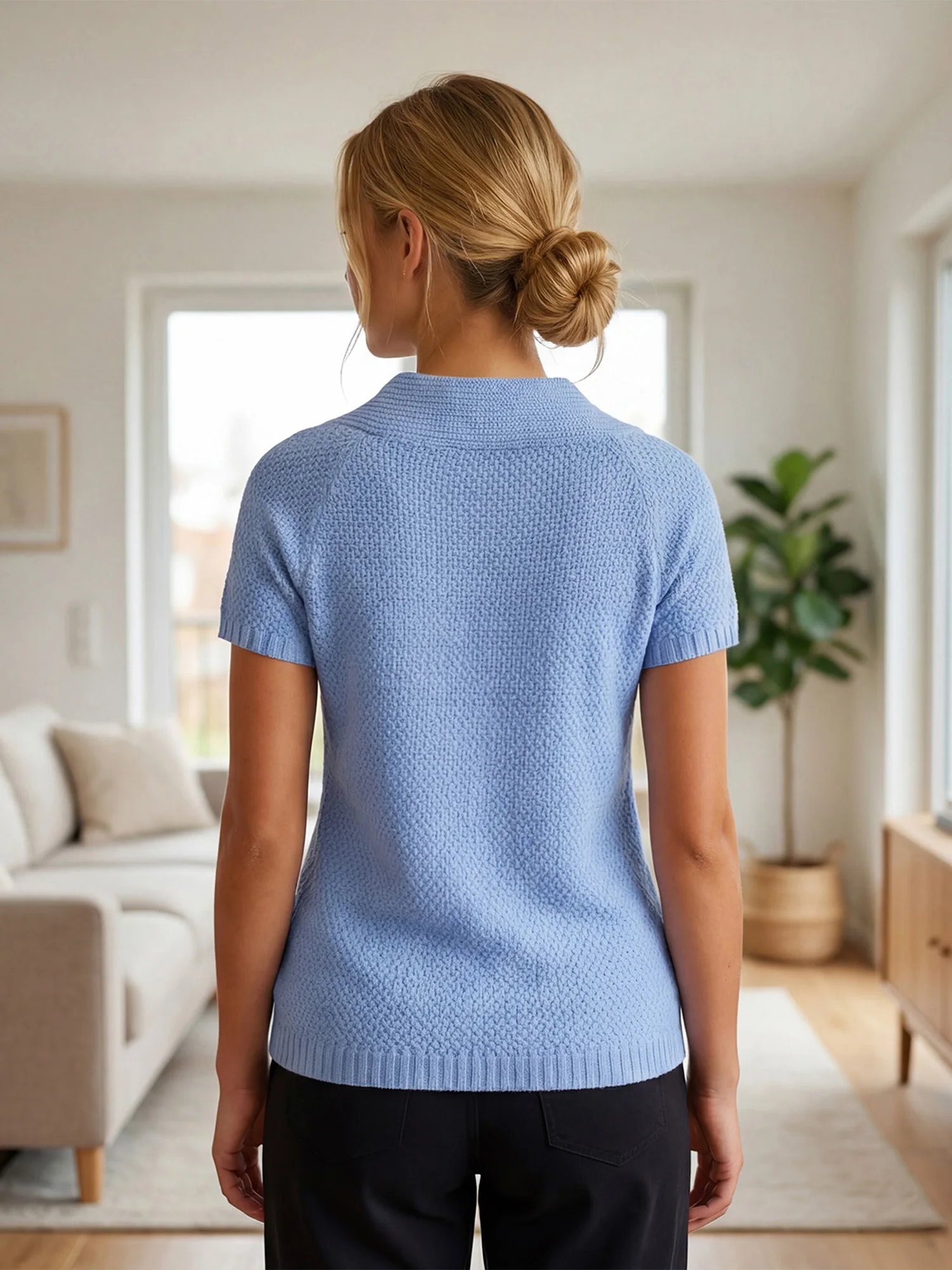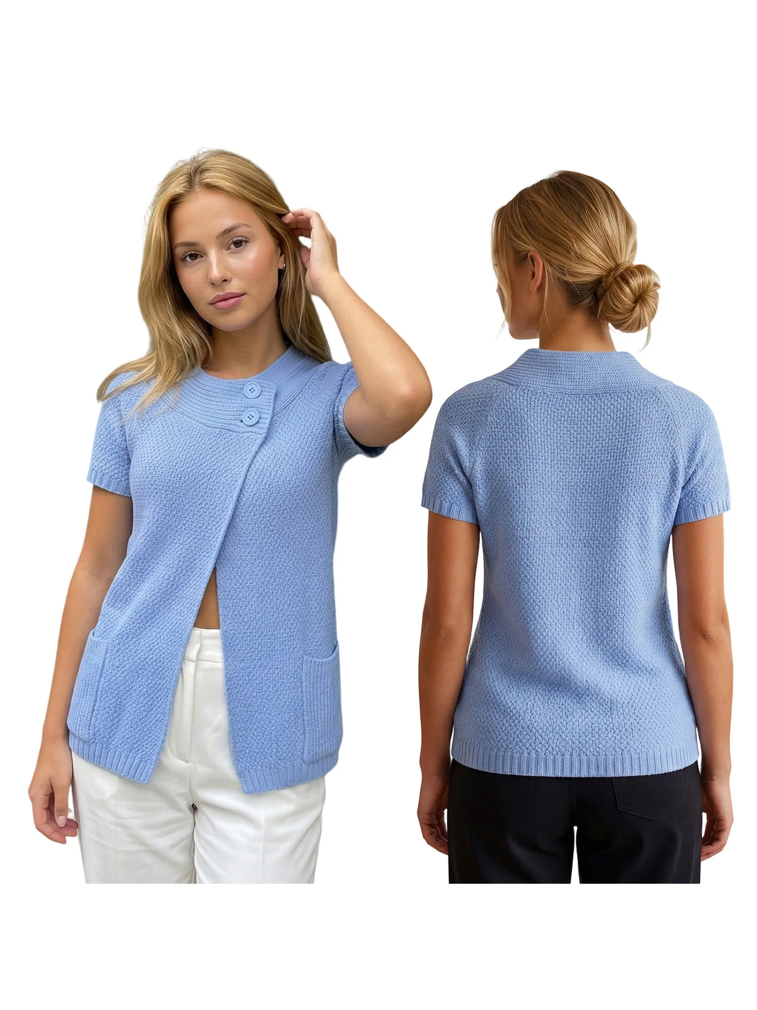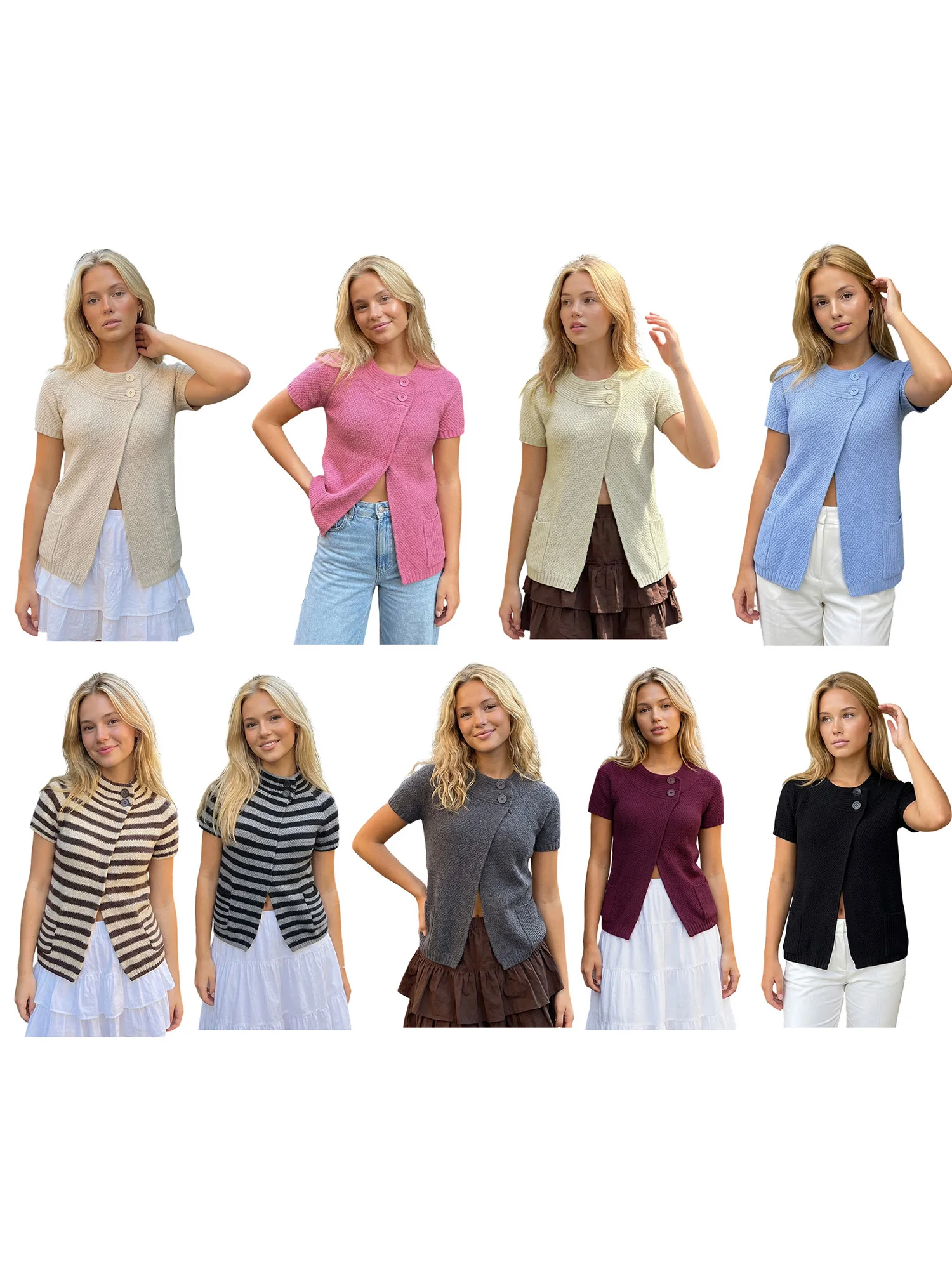 Women's Crew Neck Knit Cardigan Casual Short Sleeve Solid Color/Stripes Button Down Sweater Outwear