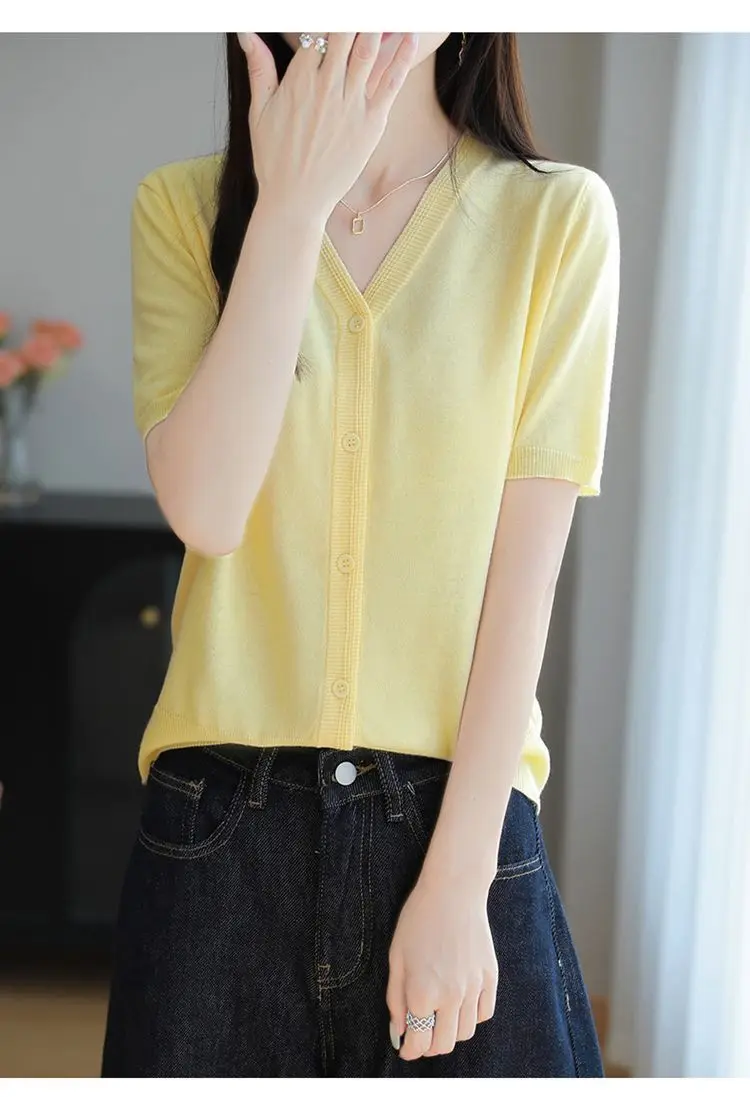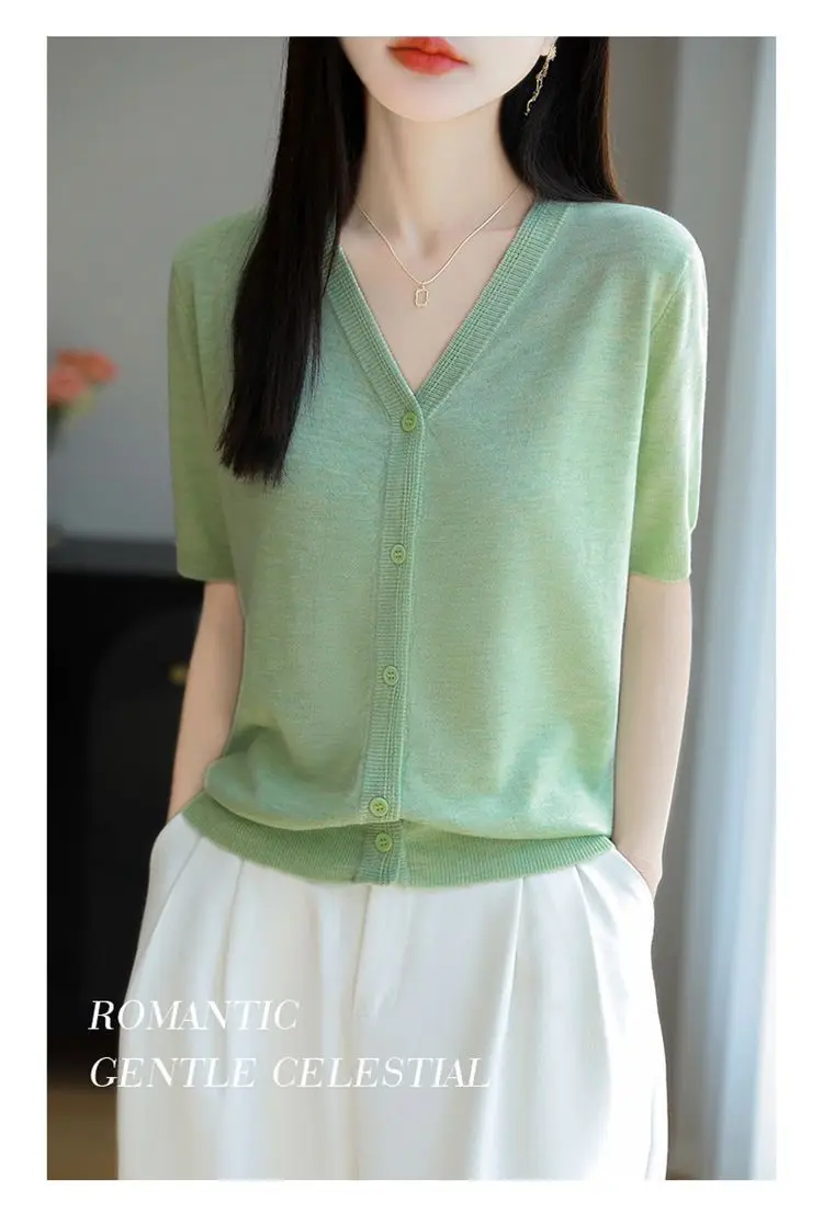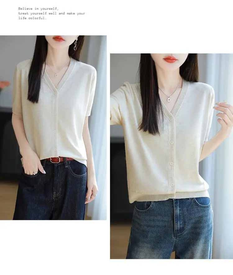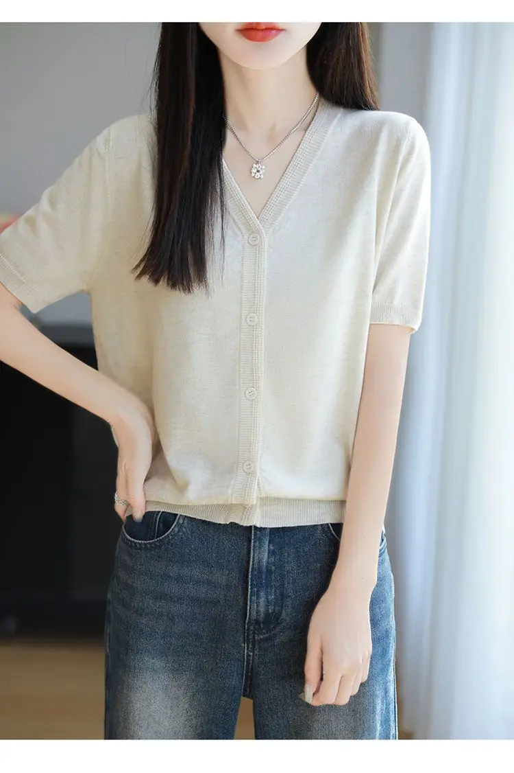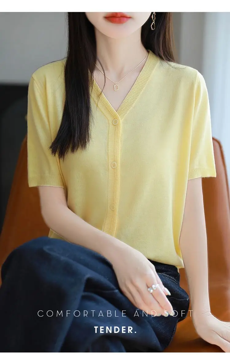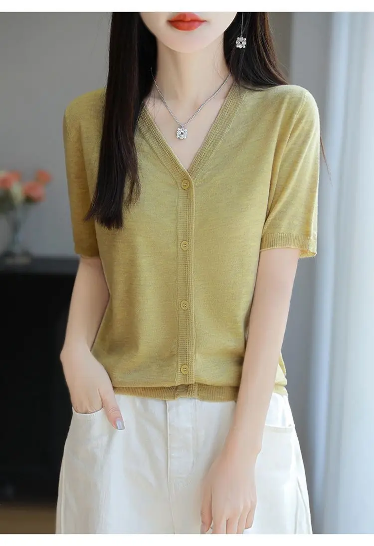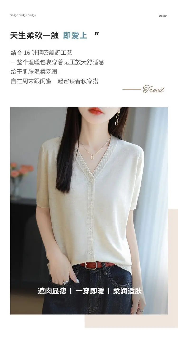 Women's Korean Style Worsted Wool Knit Top V-Neck Short Sleeve Loose Solid Color Cardigan Slimming T-Shirt For Summer