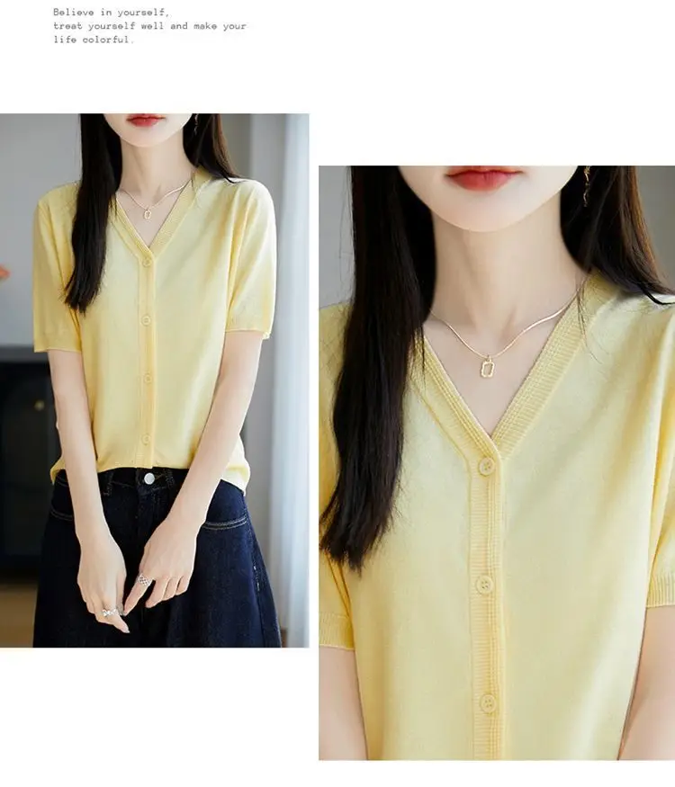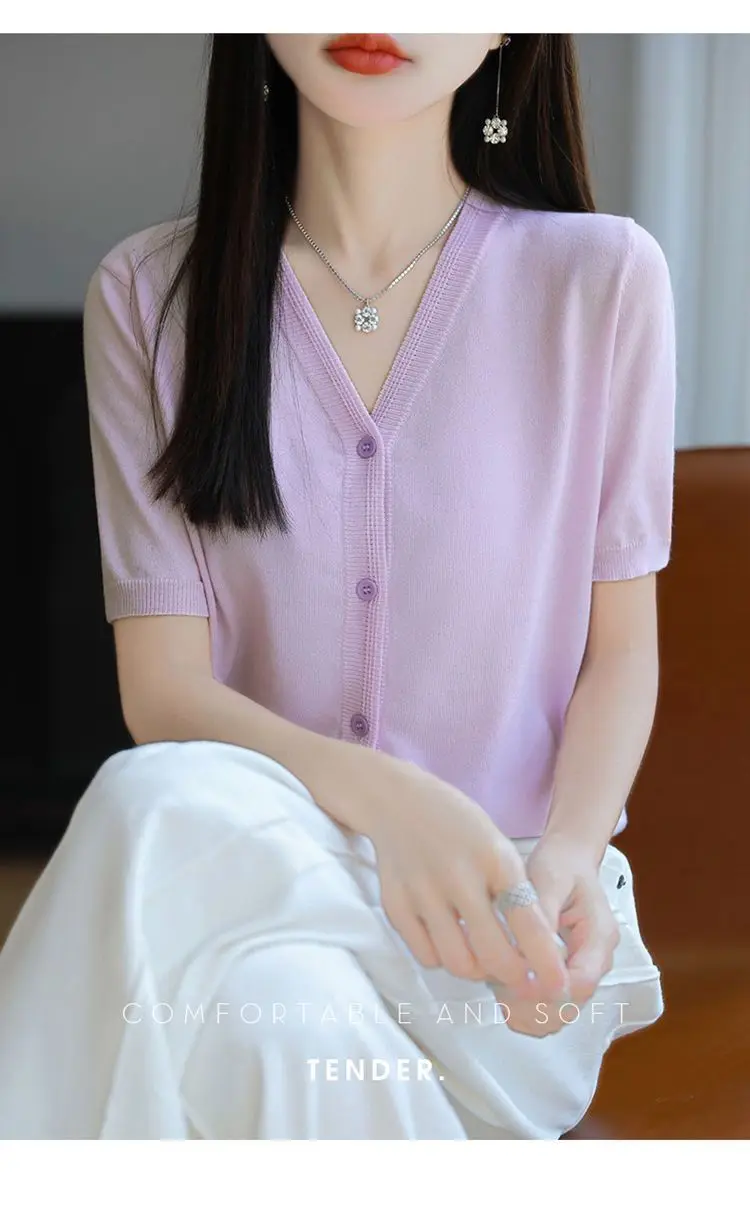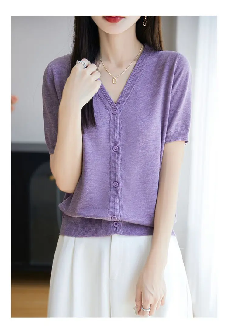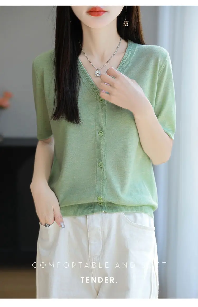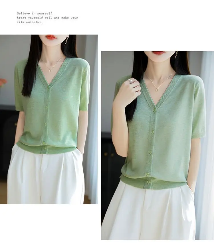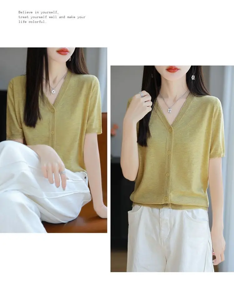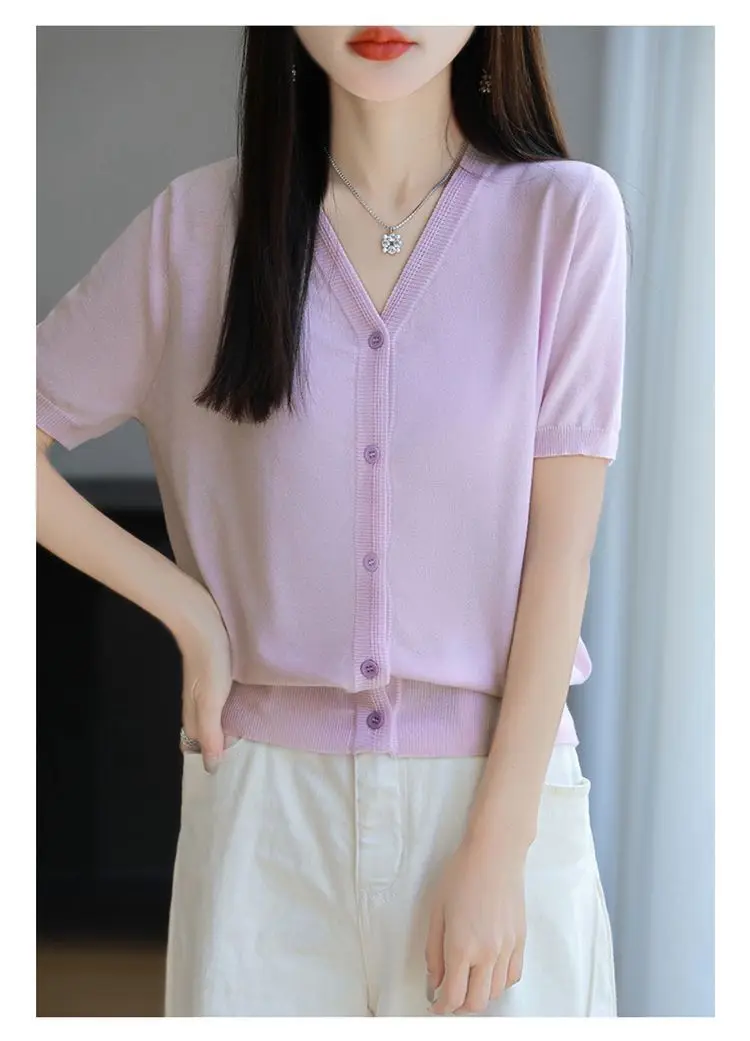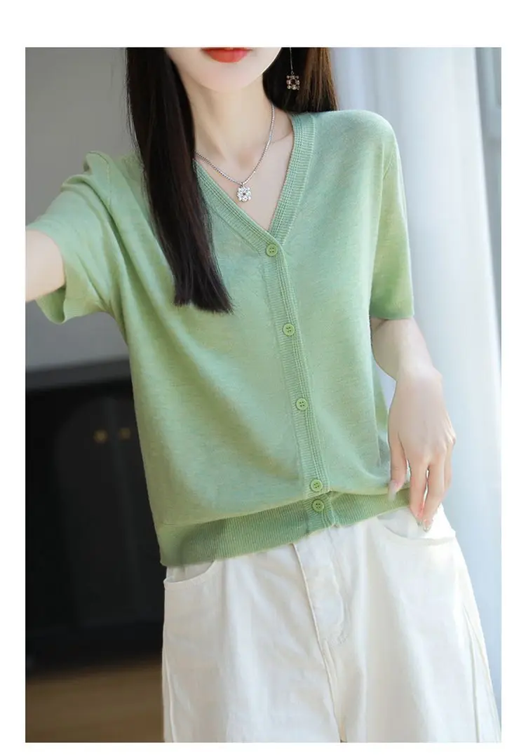 Women's Korean Style Worsted Wool Knit Top V-Neck Short Sleeve Loose Solid Color Cardigan Slimming T-Shirt For Summer