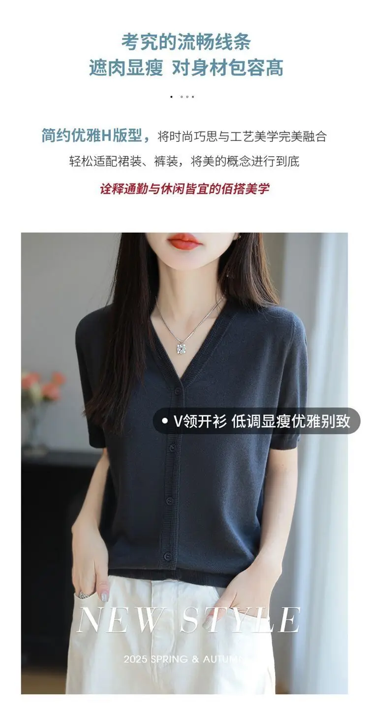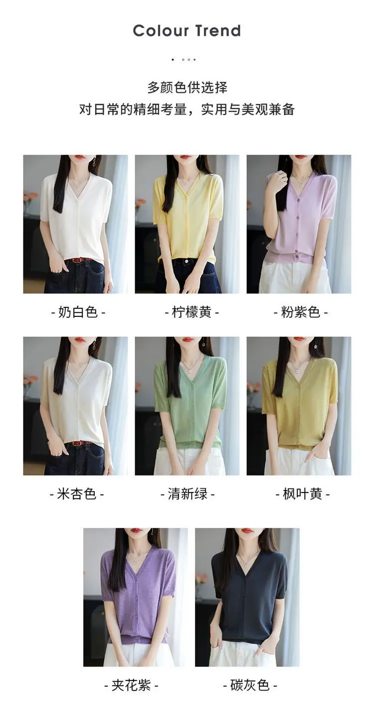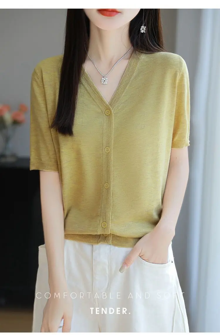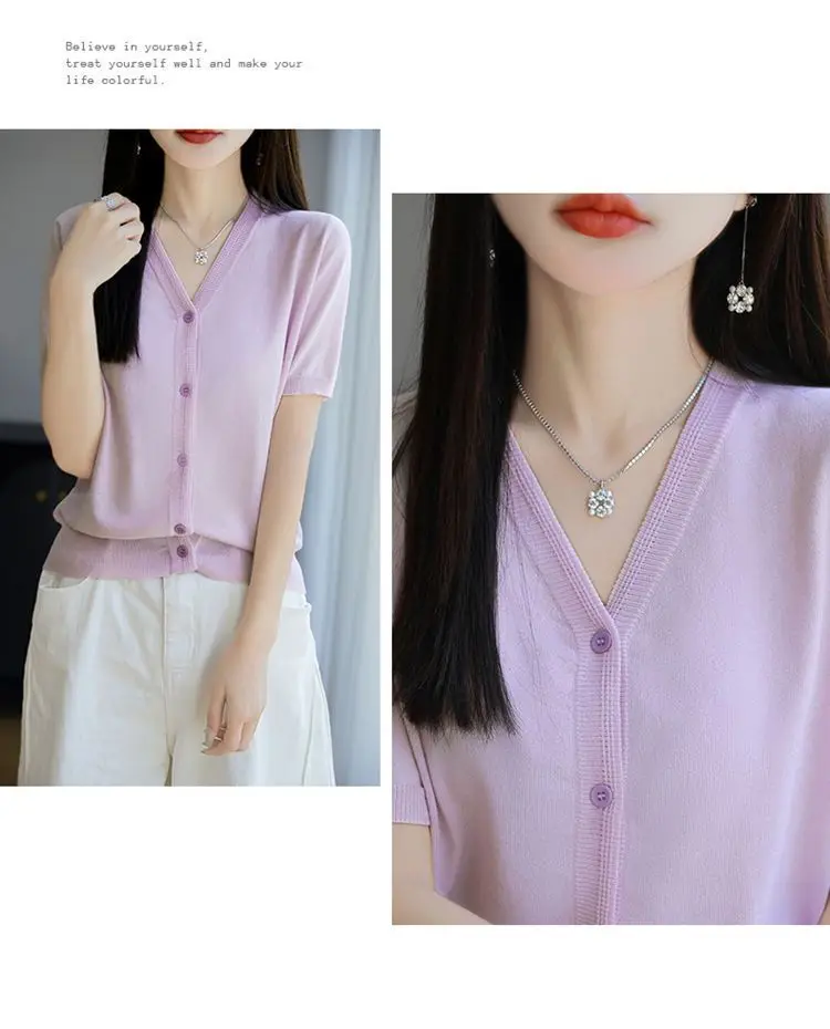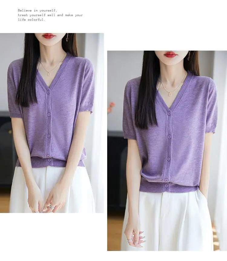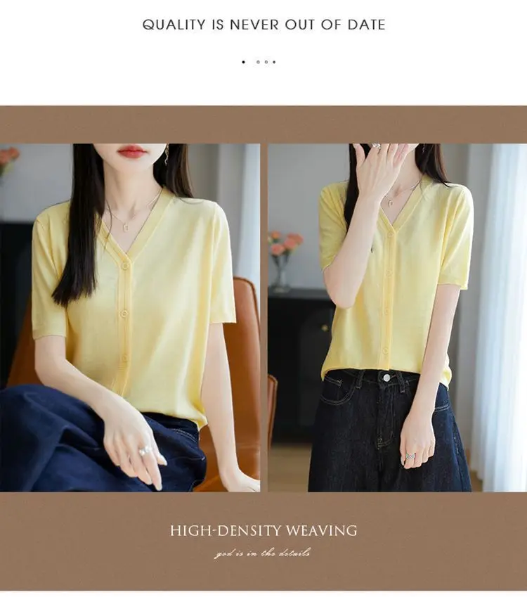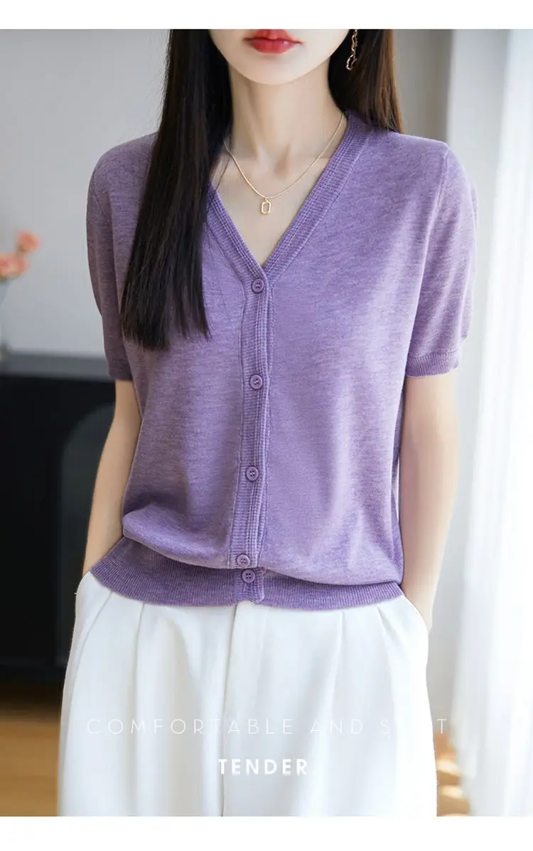 Women's Korean Style Worsted Wool Knit Top V-Neck Short Sleeve Loose Solid Color Cardigan Slimming T-Shirt For Summer