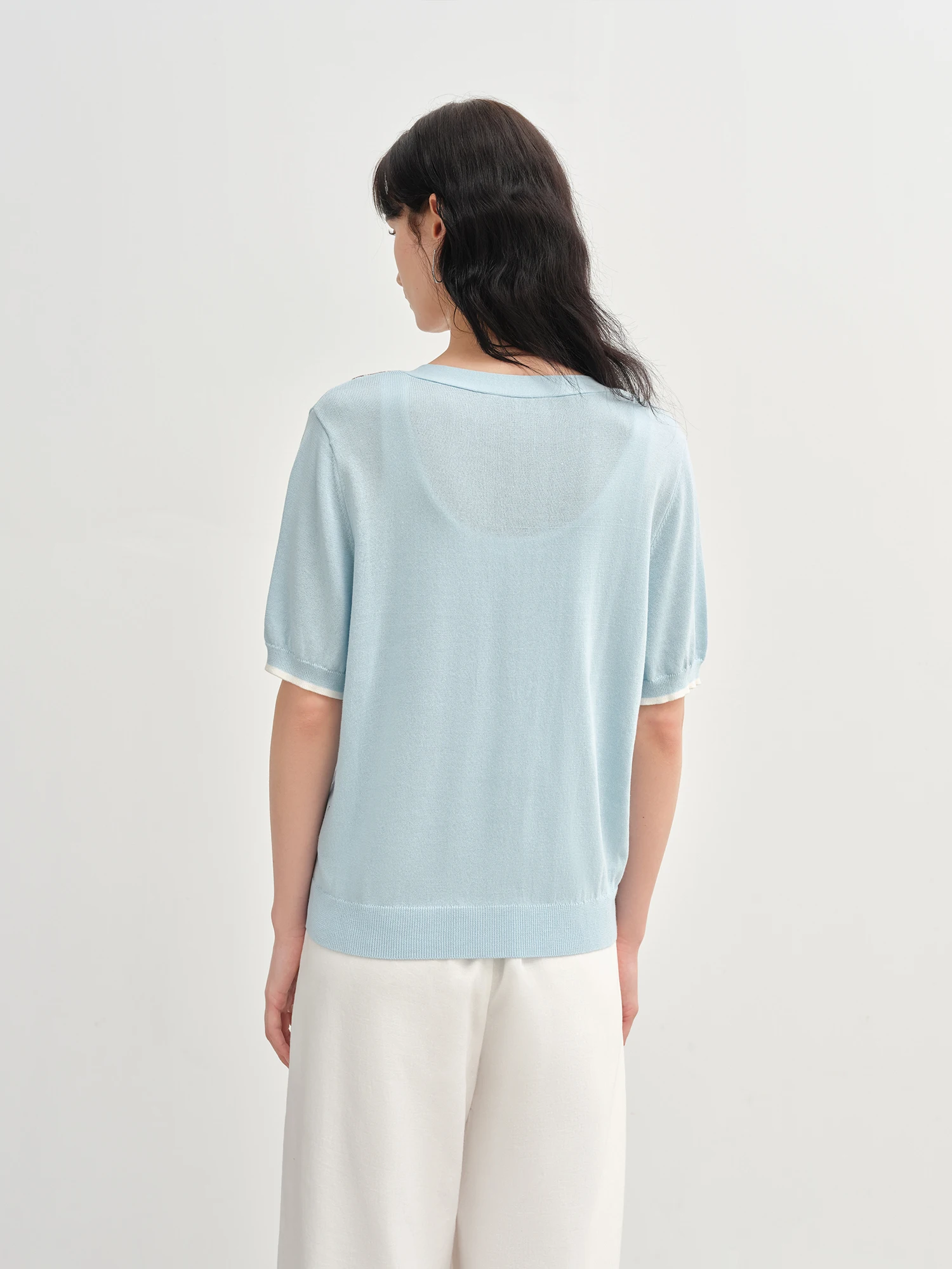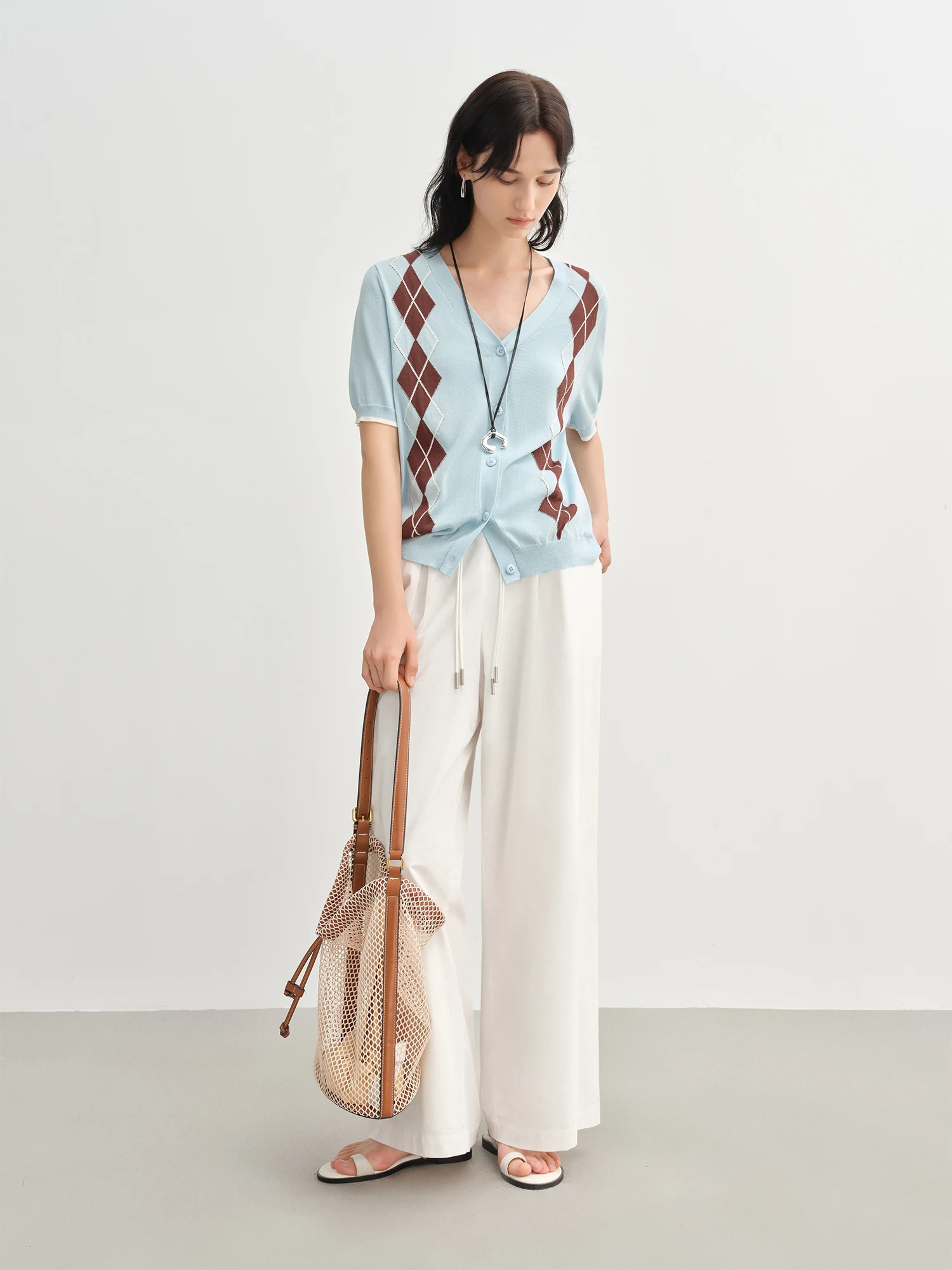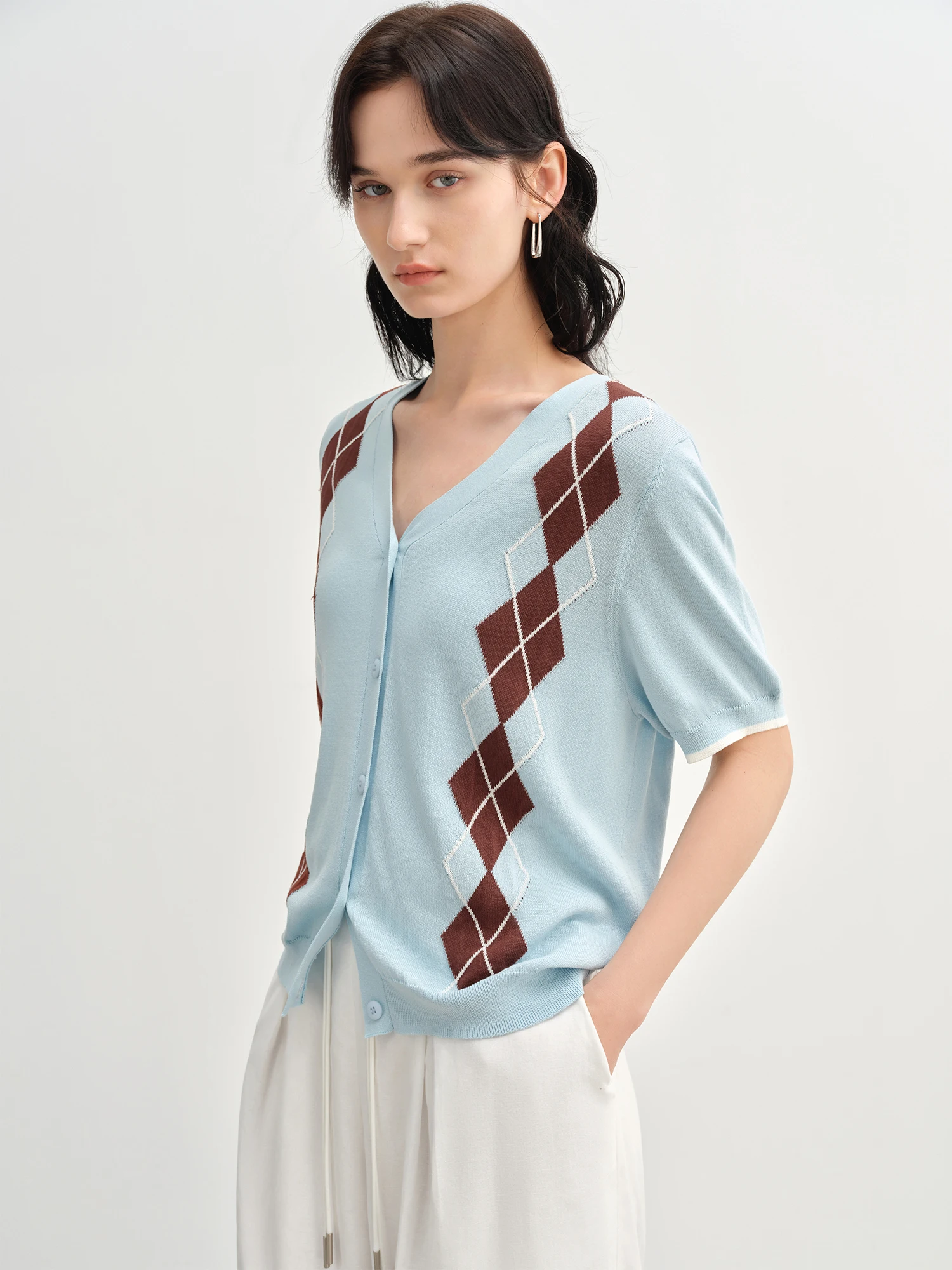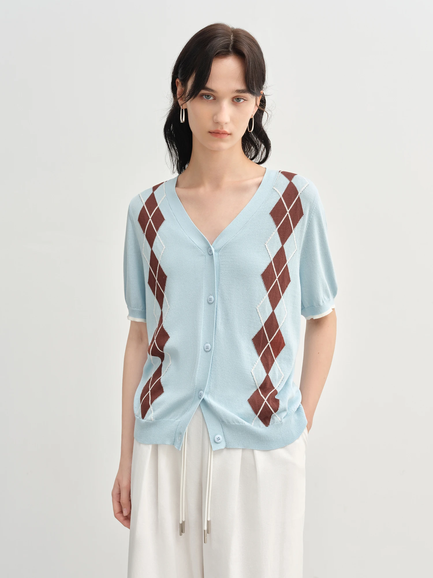 DUSHU 2025 Summer Women's Diamond Knit Cardigan - Fresh Preppy-Inspired Color Blocking & Breeze Comfort Short Sleeve
