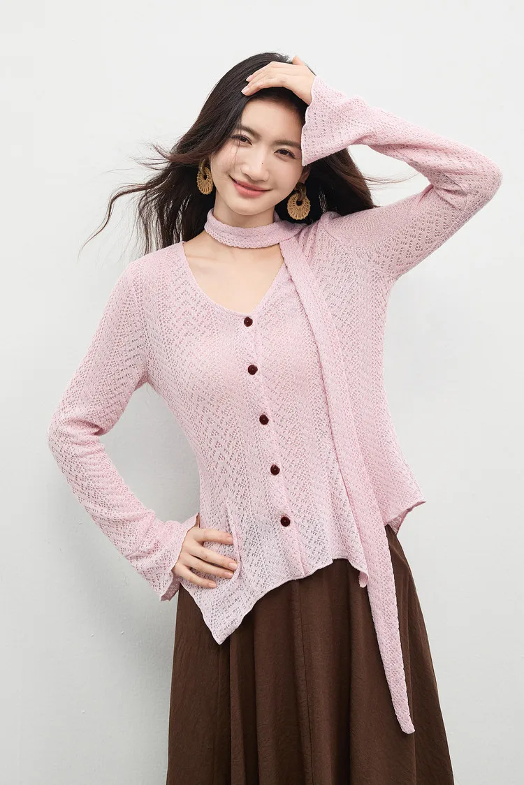 wave-textured wooden buttons, visually elongates the neckline, allowing you