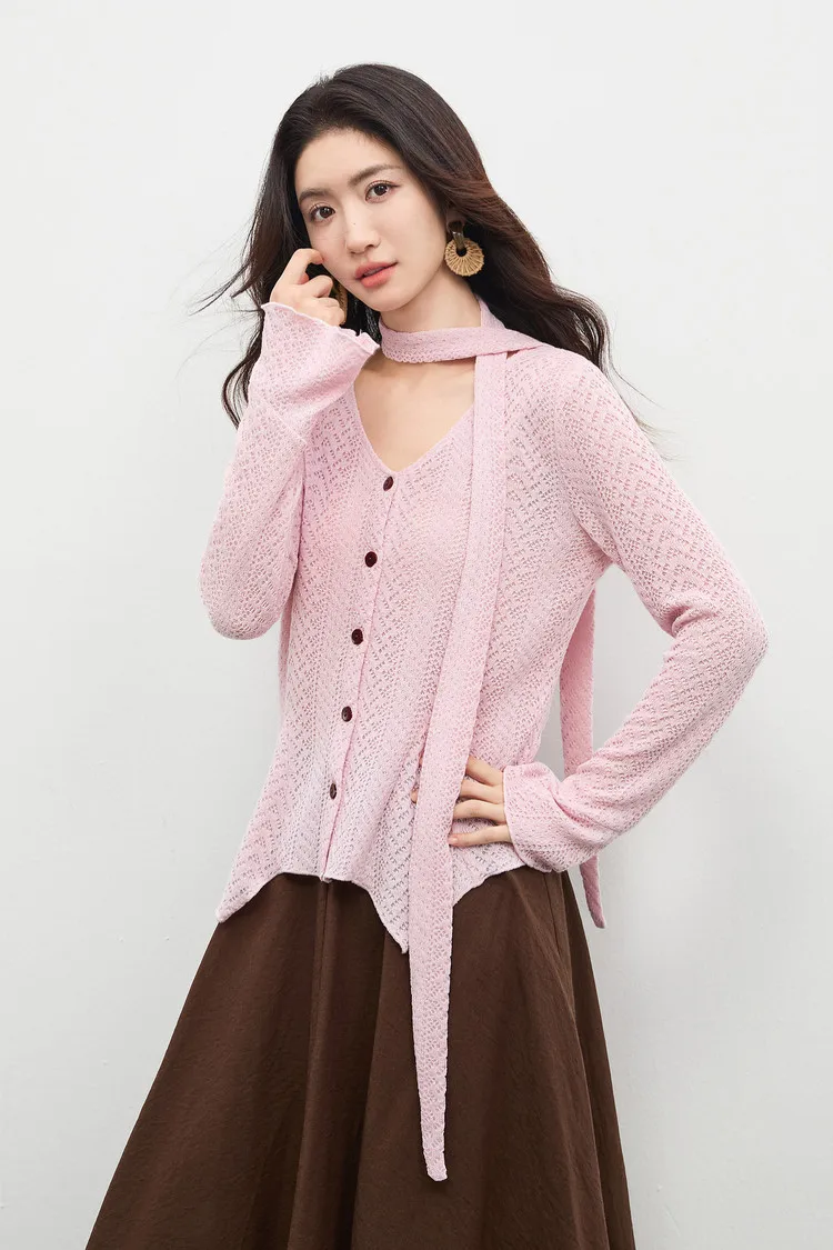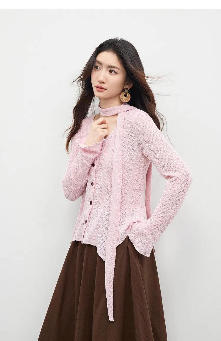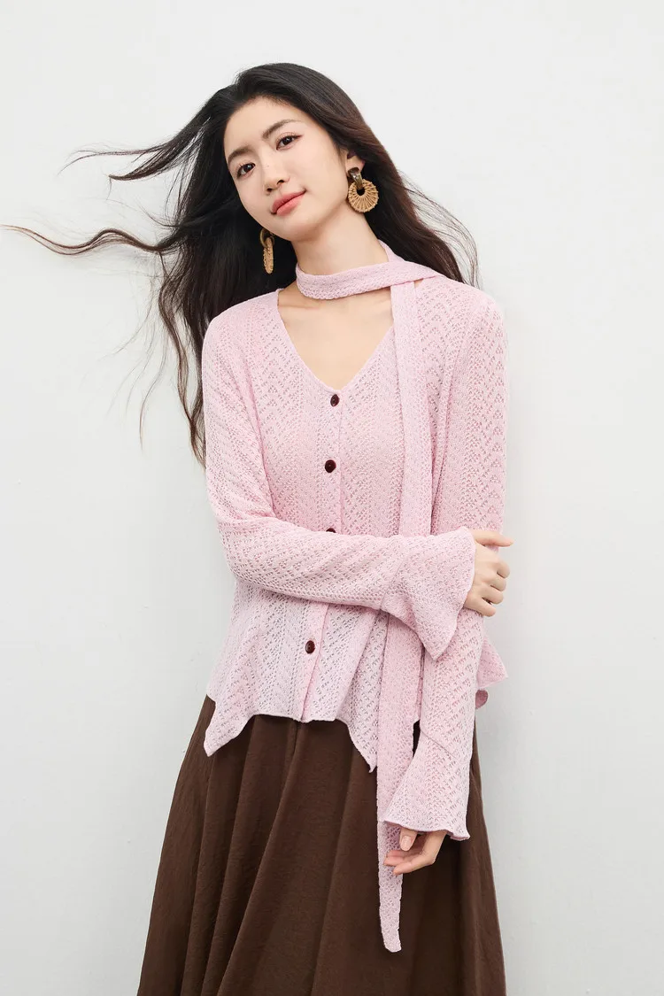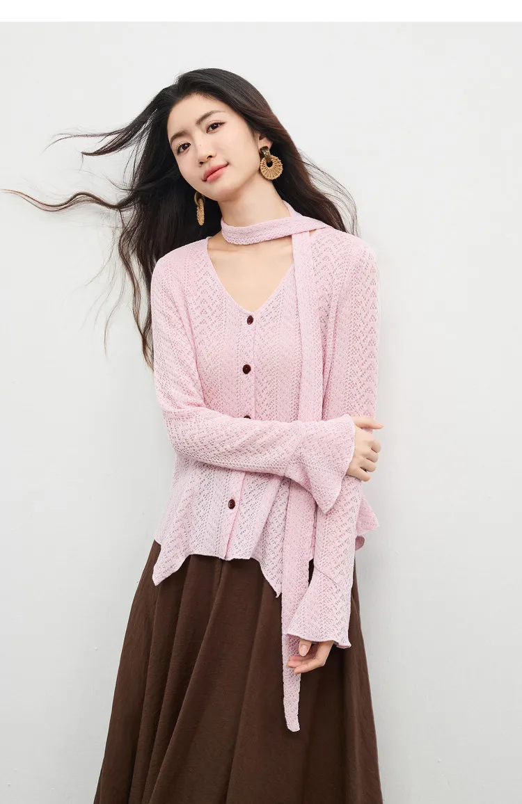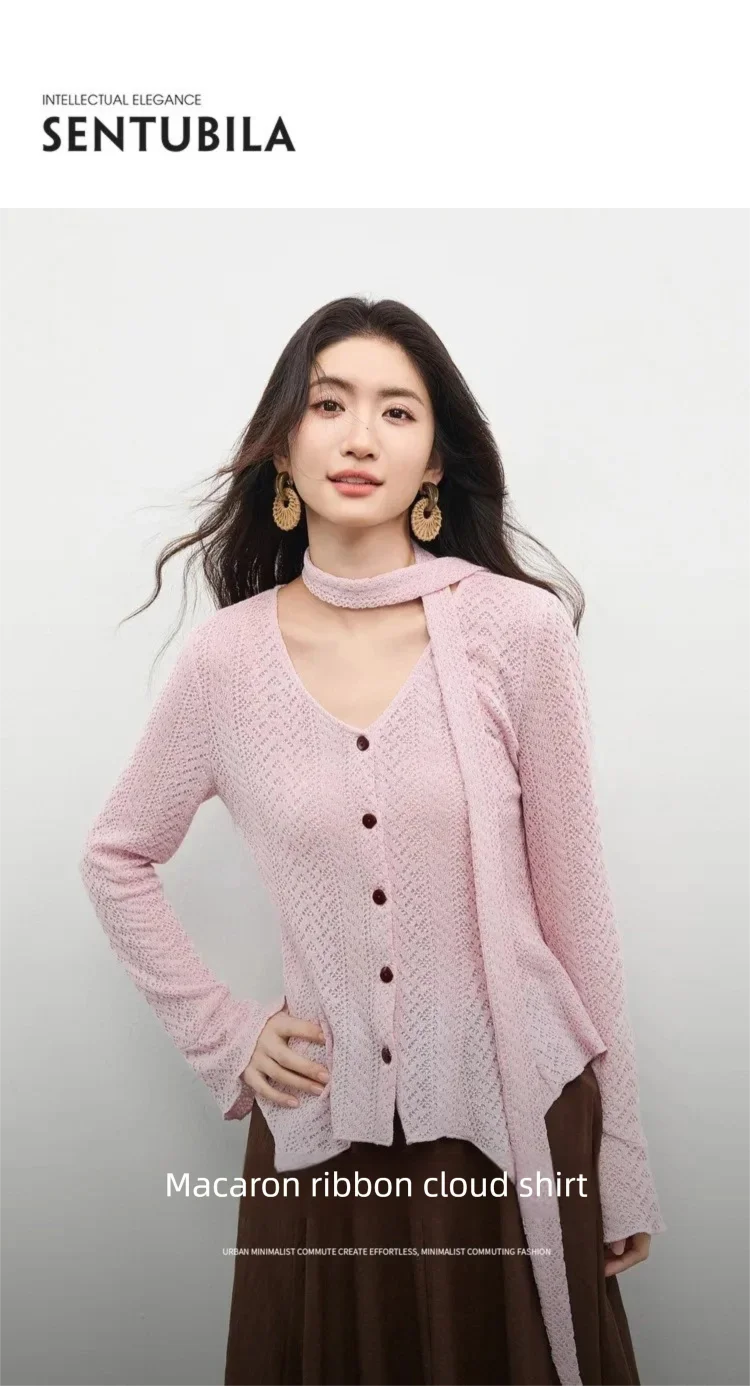SENTUBILA Sweet Cardigan for Women 2026 Detachable Ribbon Hollow Out V Neck Knitwear Spring New Flared Sleeve Sweater Q61HB5371
