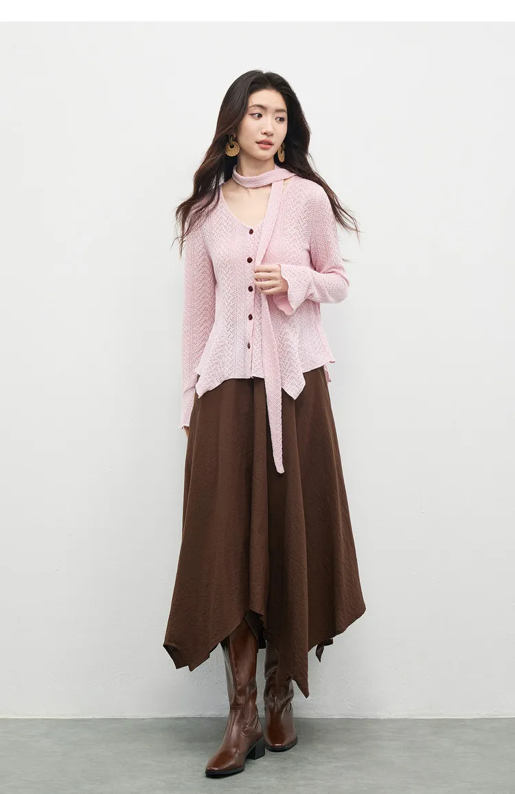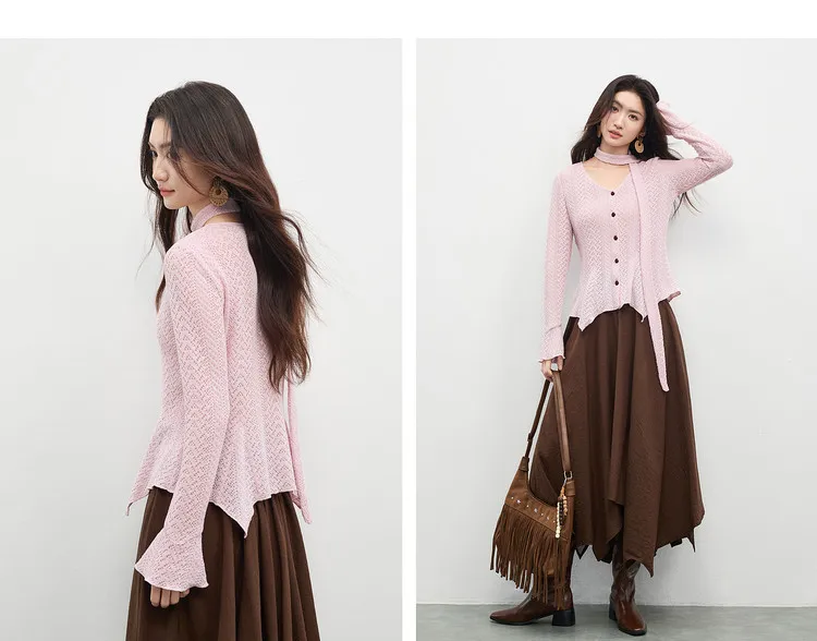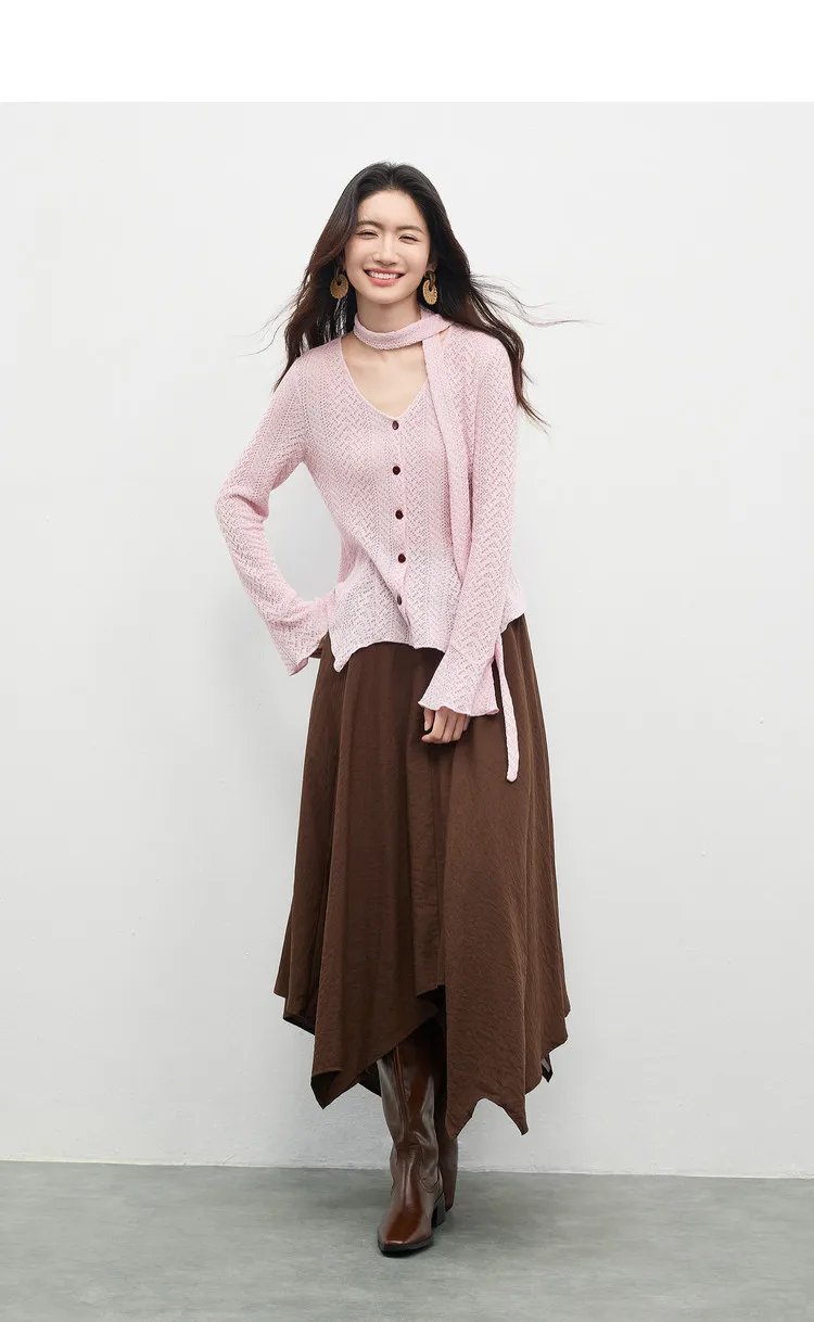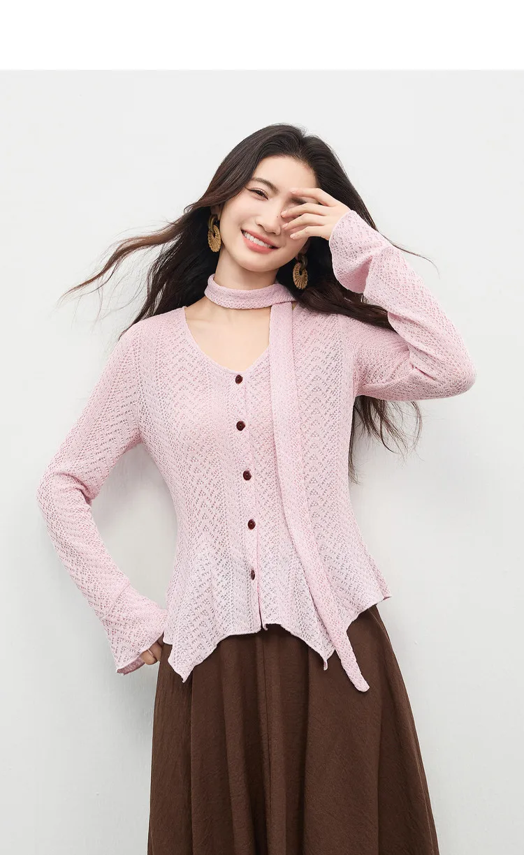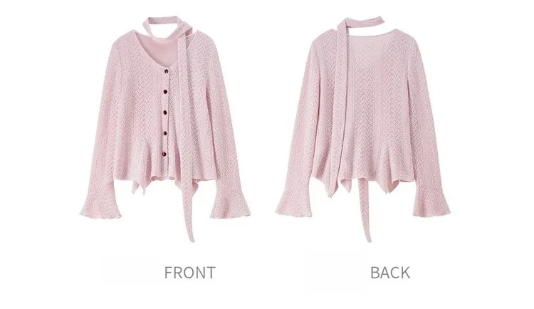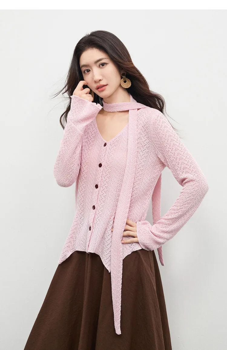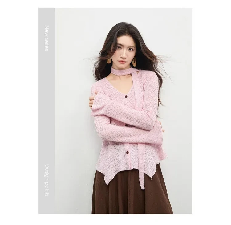 SENTUBILA Sweet Cardigan for Women 2026 Detachable Ribbon Hollow Out V Neck Knitwear Spring New Flared Sleeve Sweater Q61HB5371