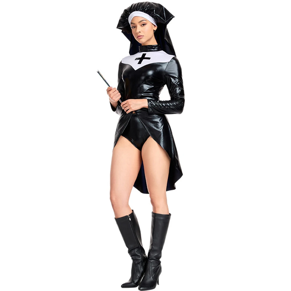 Halloween sexy Cross Nun cosplay Costumes Women's Carnival Role Play Party Nurse dress Black patent leather Performance Costume