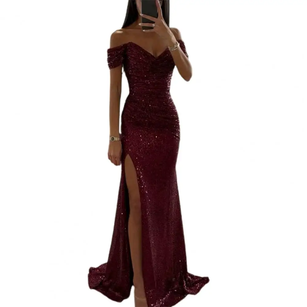 Elegant V-Neck Off Shoulder Maxi Dress Sequin Pleated Short Sleeve Waist Tight Evening Party Prom Dress Slim Sexy Split Long Dress
