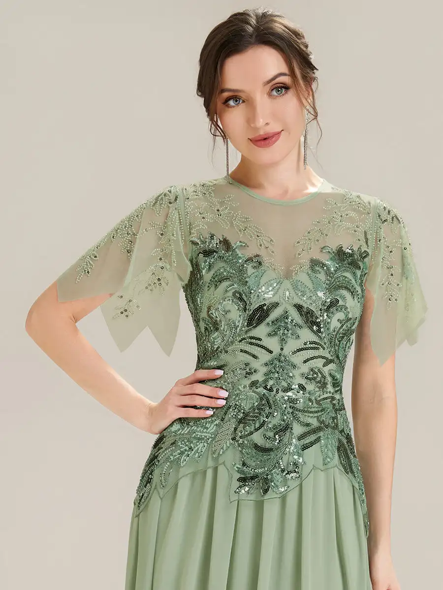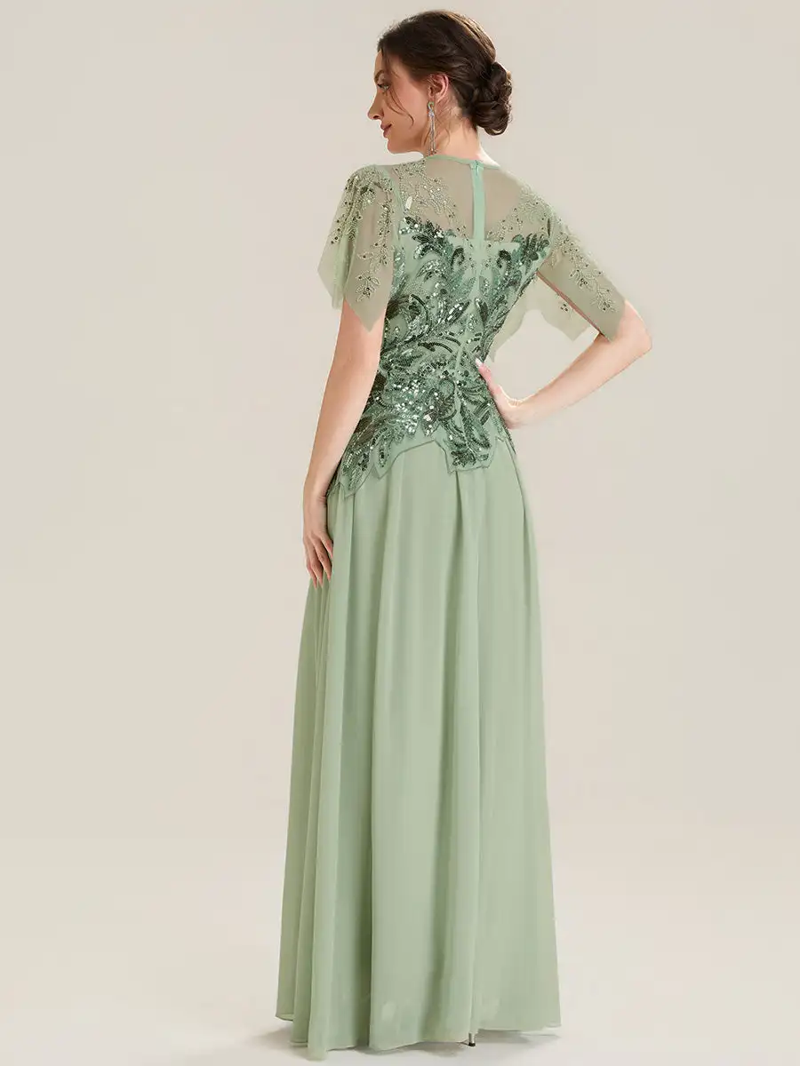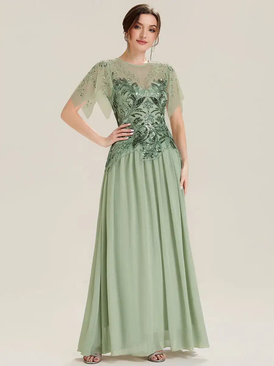 BAZIIINGAAA Party Dress A Short Sleeve Ruffle Sequin Round Neck A-Line Floor Length Evening Dresses