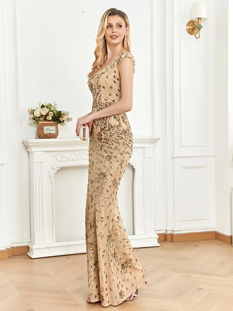 Hot Elegant Champagne Sequin Evening Dress Beauty Women Long Mermaid Formal Deep V-neck Prom Luxury Wedding Party Gowns Dresses